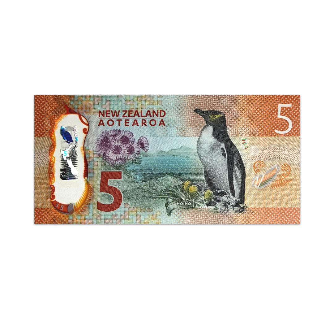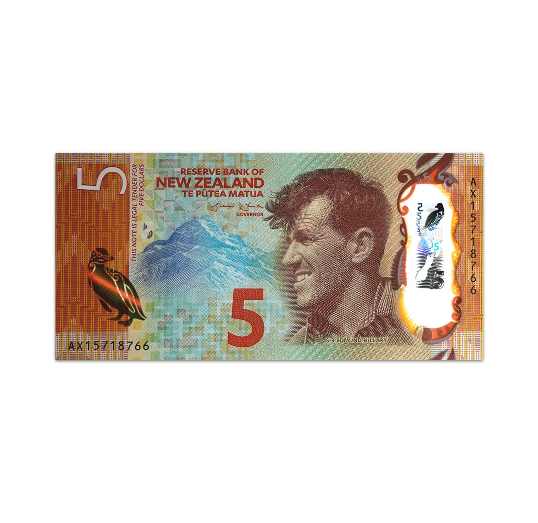 This uncirculated 5 New Zealand dollar banknote is a standard circulation banknote issued by the Reserve Bank of New Zealand as part of the Brighter Money series. It is a brown and orange polymer banknote that is dated 2015, bears the signature of Bank Governor Graeme Wheeler, and measures 135 mm x 66 mm. Its obverse side shows a gold penguin SPARK feature, Mount Cook/Aoraki, and the mountaineer Sir Edmund Hillary. Its reverse side displays a daisy (Pleurophyllum speciosum) flower, a yellow-eyed penguin (Megadyptes antipodes) bird, and ferns. Because it is a polymer note, it does not have a security thread or a watermark. This note was honored as the IBNS Bank Note of the Year 2015.