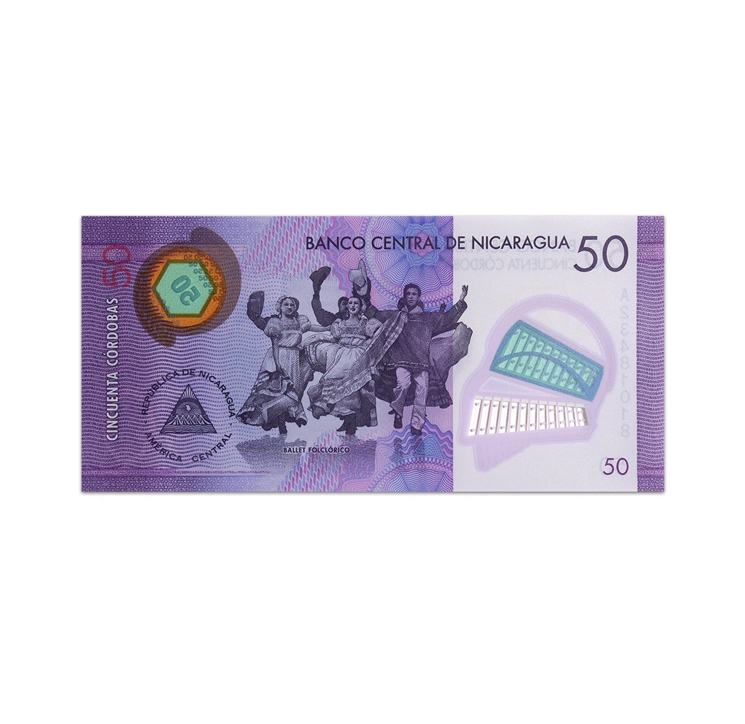 The Nicaragua 50 Cordobas Banknote is part of the 2014 issues of the Central Bank of Nicaragua printed on polymer. The obverse of the purple banknote features two xylophones, palm trees, a flag, and the entrance to the craft market building in Masaya. The reverse reflects the coat of arms of Nicaragua, folkloric ballet dancers, and two xylophones. The paper bill contains a simulated solid security thread and a watermark that reveals the denomination. The banknote is 141 x 67 mm in size and is in uncirculated condition.