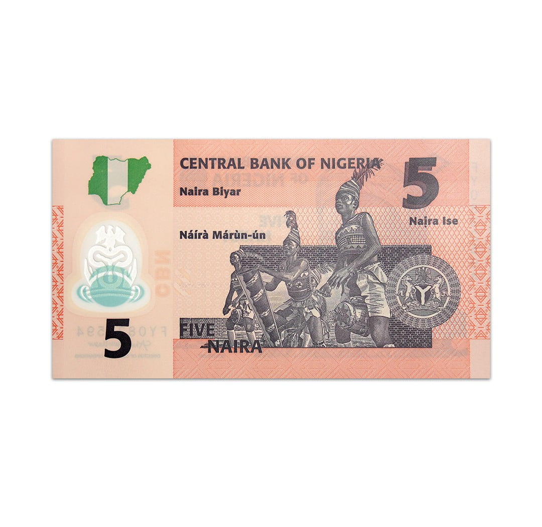 This uncirculated 5 Nigerian naira polymer note, dated 2021, bears the signatures of Central Bank Governor Godwin Emefiele and Director of Currency Operations Ahmed Bello Umar. On its obverse side, it proudly displays Prime Minister Alhaji Sir Abubakar Tafawa Balewa alongside the bank logo. The reverse side features the map of Nigeria, four Nkpokiti dancers, and the Nigerian coat of arms. Although lacking a security thread, the note includes a CBN watermark for authenticity assurance. Its dimensions measure 130 mm by 72 mm.