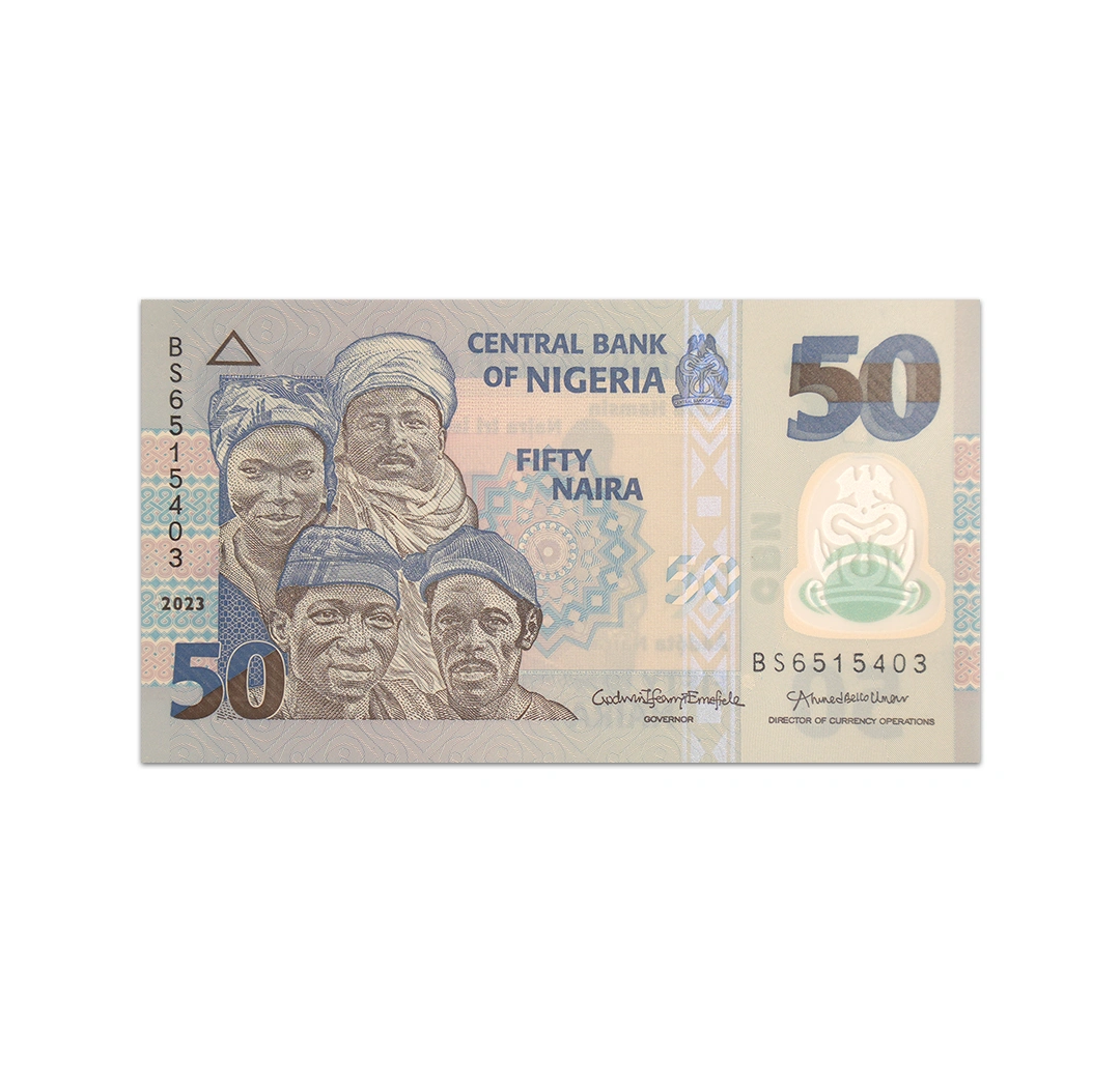This uncirculated 50 Nigerian naira banknote is a standard circulation banknote issued by the Central Bank of Nigeria. It is a blue polymer banknote that is dated 2021, bear the signatures of Bank Governor Godwin Emefiele and Currency Operations Director Ahmed Bello Umar, and measures 130 mm x 72 mm. Its obverse side features the Central Bank of Nigeria logo, a woman, and three men who represent the major tribes in Nigeria. Its reverse side depicts the map of Nigeria, the national emblem of Nigeria, and three fishermen. Because the banknote is made of polymer, it does not have a security thread. However, it still has a CBN watermark.