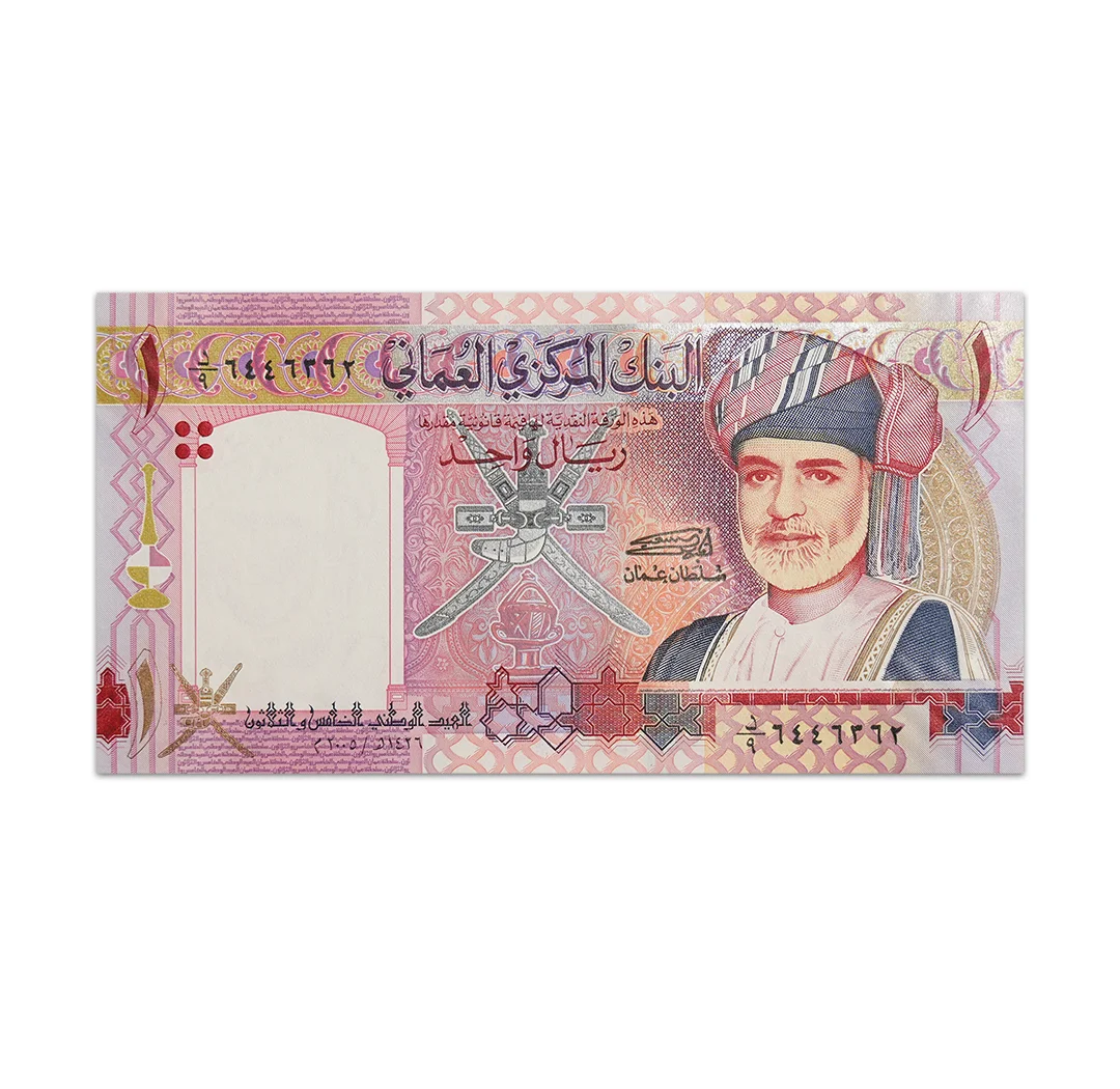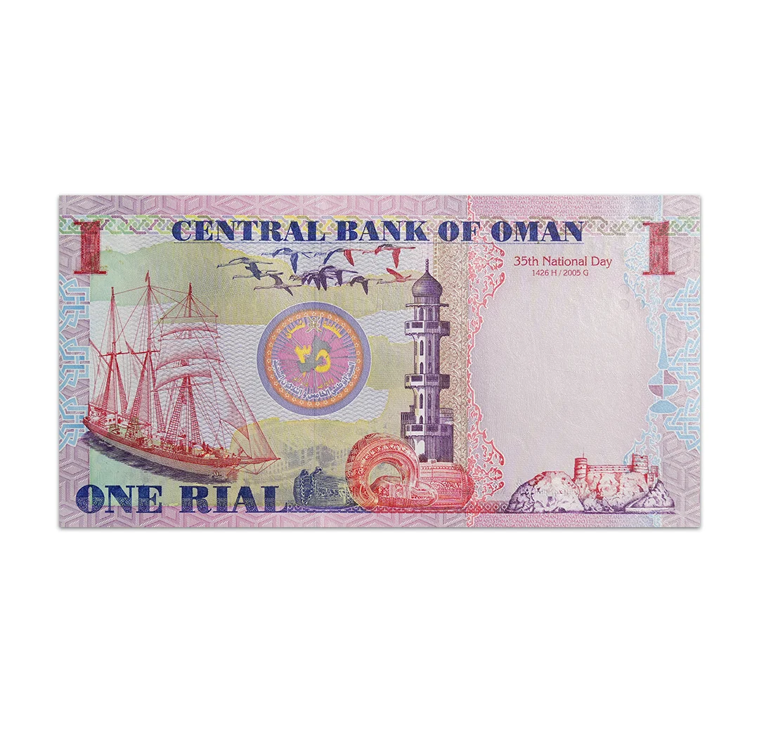 The Oman 1 Rial banknote is part of the 2005 issues. It is purple in color and measures 145 x 76 mm. The obverse side shows the coat of arms with crossed swords and khanjar (dagger), an incense burner, and a portrait of Sultan Qaboos bin Said. The reverse side features the Shabab Oman sailing ship, birds, the 35th National Day logo, the mosque minaret, jewelry, and Jalali Fort. This banknote uses a solid security thread and contains a watermark with a sultan and cornerstones design.