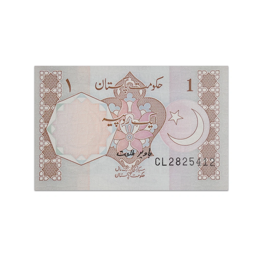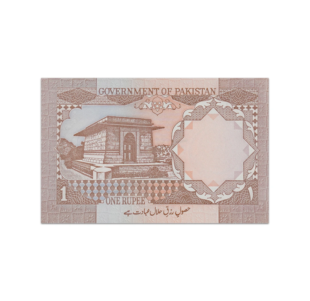 This uncirculated 1 Rupee Pakistan note is a standard circulation banknote issued by the Government of Pakistan. It is a brown, light blue, orange, and lilac note that is dated 1994 ND, bears the signature of Javed Talat, and measures 95 x 60 mm. Its obverse side features a crescent moon and star. Its reverse side shows the Tomb of Allama Muhammad Iqbal in Lahore, with revised Urdu inscription below. Though there is no security thread, there is still a watermark of crescent moon and star.