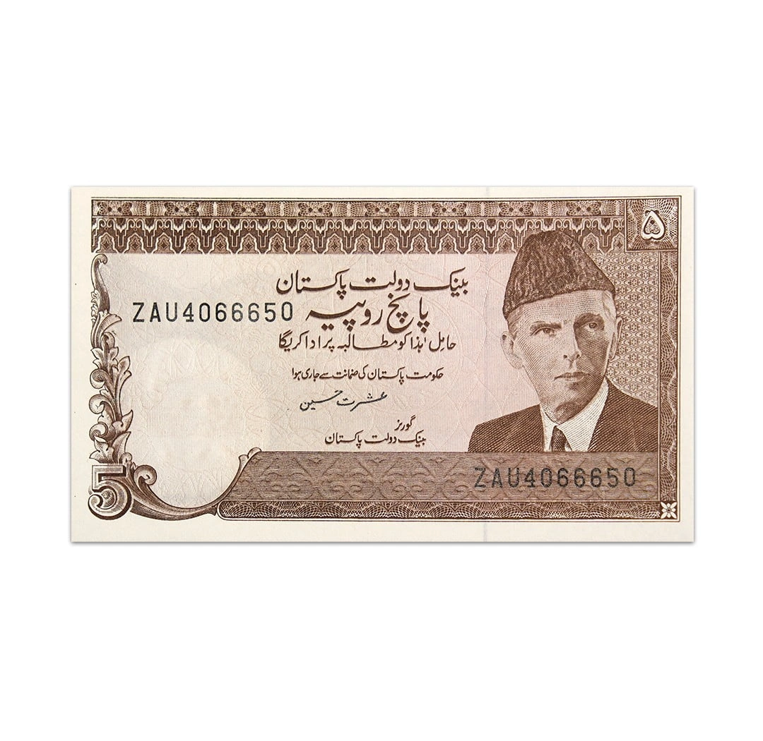 This uncirculated 5 Rupees Pakistan note is a standard circulation banknote issued by the State Bank of Pakistan. It is a brown, pink, orange, and purple note that is dated 1999 ND, bears the signature of Ishrat Hussain, and measures 128 x 72 mm. Its obverse side features Mohammed Ali Jinnah wearing a jacket and tie. Its reverse side shows bank logo, railroad tracks entering Khojak Tunnel in Killa Abdullah district of Balochistan with revised Urdu inscription beneath bank name. Security features include a solid security thread and a watermark of Mohammed Ali Jinnah. This note was demonetized on 31 December 2021.