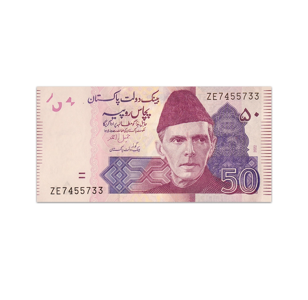 This uncirculated 50 Pakistani rupee note is a standard circulation banknote issued by the State Bank of Pakistan. It is a purple, violet, and orange note that is dated 2022, bears the signature of Reza Baqir, and measures 131 mm x 65 mm. Its obverse side features Mohammed Ali Jinnah in a sherwani. Its reverse side shows the bank logo and the K2 peak in the Karakorum Mountains. Security features include a solid security thread with printed STATE BANK OF PAKISTAN and a watermark of Mohammed Ali Jinnah with an electrotype 50.