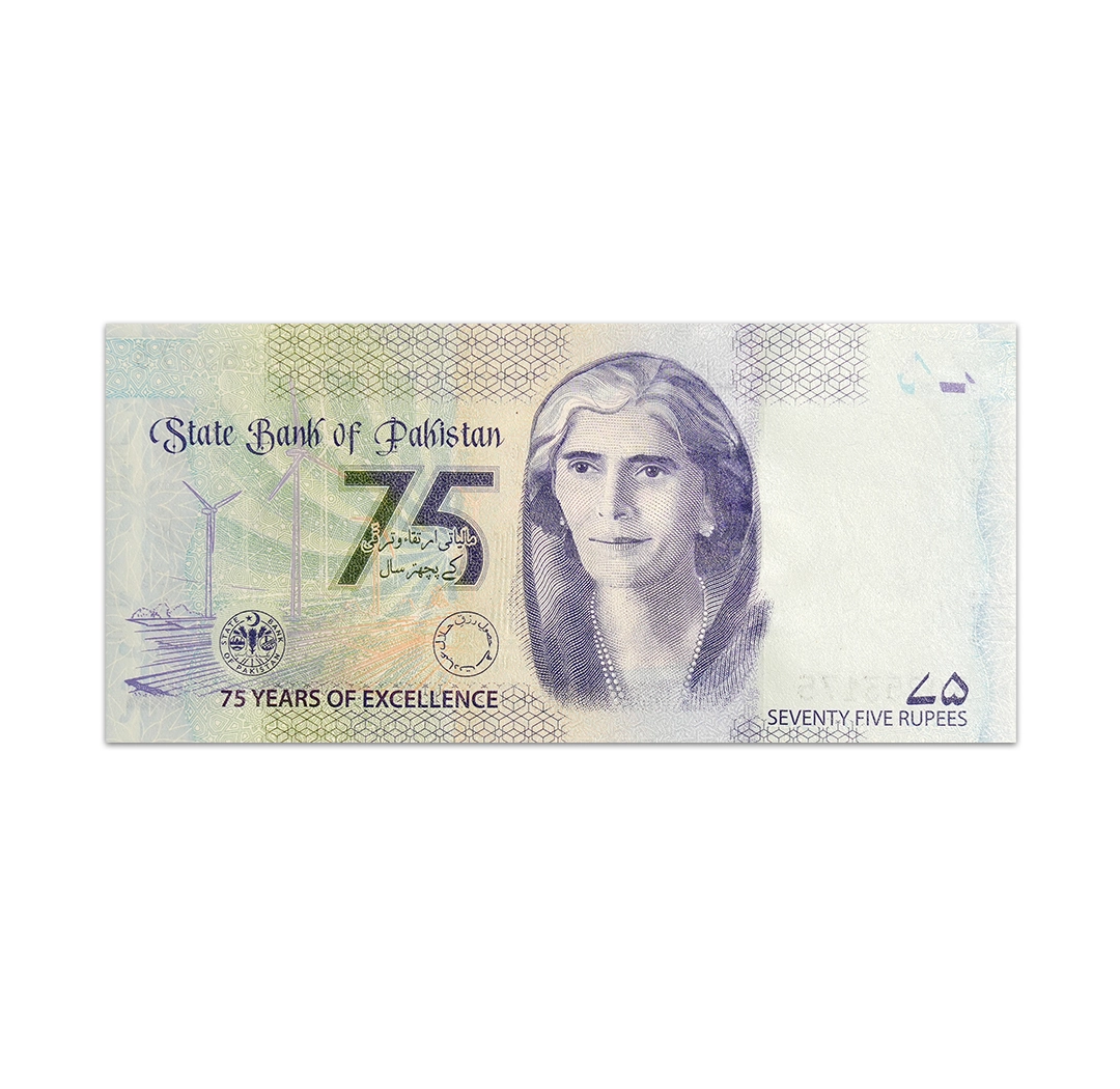 This uncirculated 75 Pakistani rupee note is a commemorative banknote issued by the State Bank of Pakistan to celebrate the 75th anniversary of the State Bank of Pakistan. It is a blue and green note that is dated 2023, bears the signature of Jameel Ahmed, and measures 139 mm x 65 mm. Its obverse side features the State Bank of Pakistan building in Karachi and a portrait of Mohammed Ali Jinnah. Its reverse side shows wind turbines and a portrait of Mohtrama Fatima Jinnah. Security features include a Pureimage windowed holographic security thread with a demetallized 75 and a watermark of Mohammed Ali Jinnah with an electrotype 75.