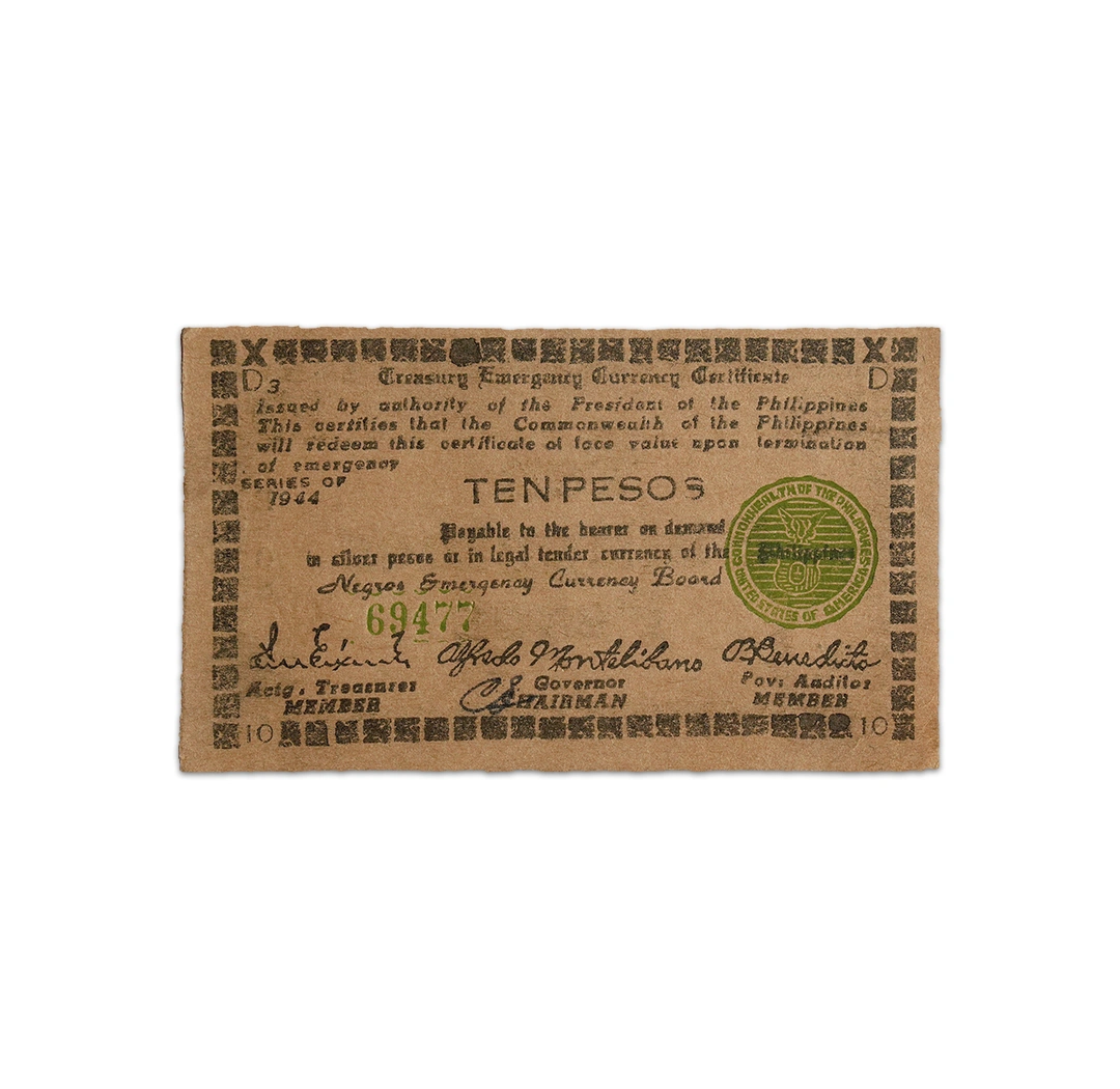 The 10 Pesos 1944 from the Province of Negros Oriental is a historical Treasury Emergency Currency Certificate (TECC), issued during the Japanese Occupation of the Philippines in WWII when official currency was scarce, serving as vital local money with signatures from officials like Governor Alfredo Montelibano, featuring details such as the Negros Emergency Currency Board and redemption promises, existing in different varieties (like small/large 'Ten'), and sought after by collectors today for its historical significance.