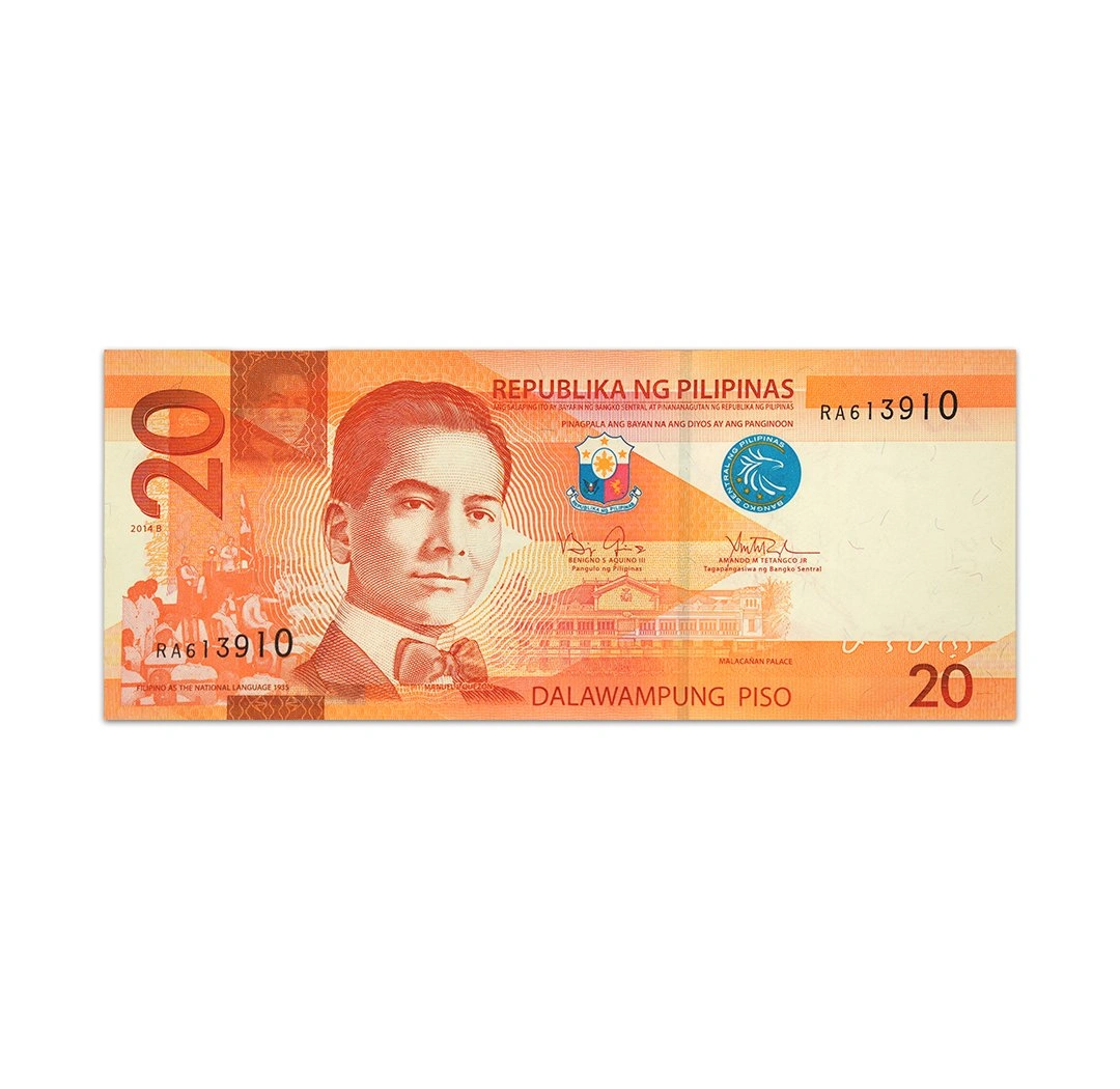 This uncirculated 20 Philippine piso banknote, dated 2014, bears the signatures of Philippine President Benigno Aquino III and Central Bank Governor Amando M. Tetangco Jr. With dimensions of 160 mm x 66 mm and an orange color scheme, it stands as a tribute to significant Filipino heritage and culture. On the obverse side, it pays homage to the Father of the Filipino language, former President Manuel Luis Quezon, alongside the Bangko Sentral seal and the Malacañang Palace, the Presidential Residence. Additionally, it commemorates the declaration of Filipino as the national language in 1935. The reverse side showcases a map of the Philippines, an Asian palm civet (Paradoxus hermaphroditus philippinensis), an Ifugao weave design, and the breathtaking Banaue Rice Terraces. Notable security features include a solid security thread and a watermark of Manuel L. Quezon, accompanied by an electrotype 20.