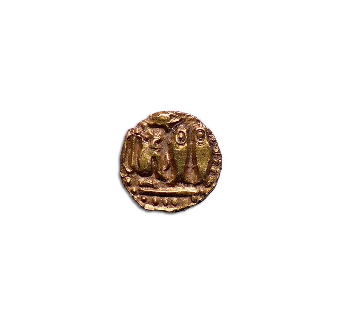 This exquisite coin, minted during the reign of Rajendra Chola I (1014–1044 CE) an artifact from the illustrious Chola Empire, Commemorates the achievements of Rajendra Chola, especially his naval expeditions and expansion of the empire.\n\n🔸Obv: Chola royal emblem of a bow, a seated tiger, a pair of fish, and an umbrella.\n🔸Rev: Nagari legend in two lines "Yuddha Malla" (युद्ध मल्ल), in Nagri script