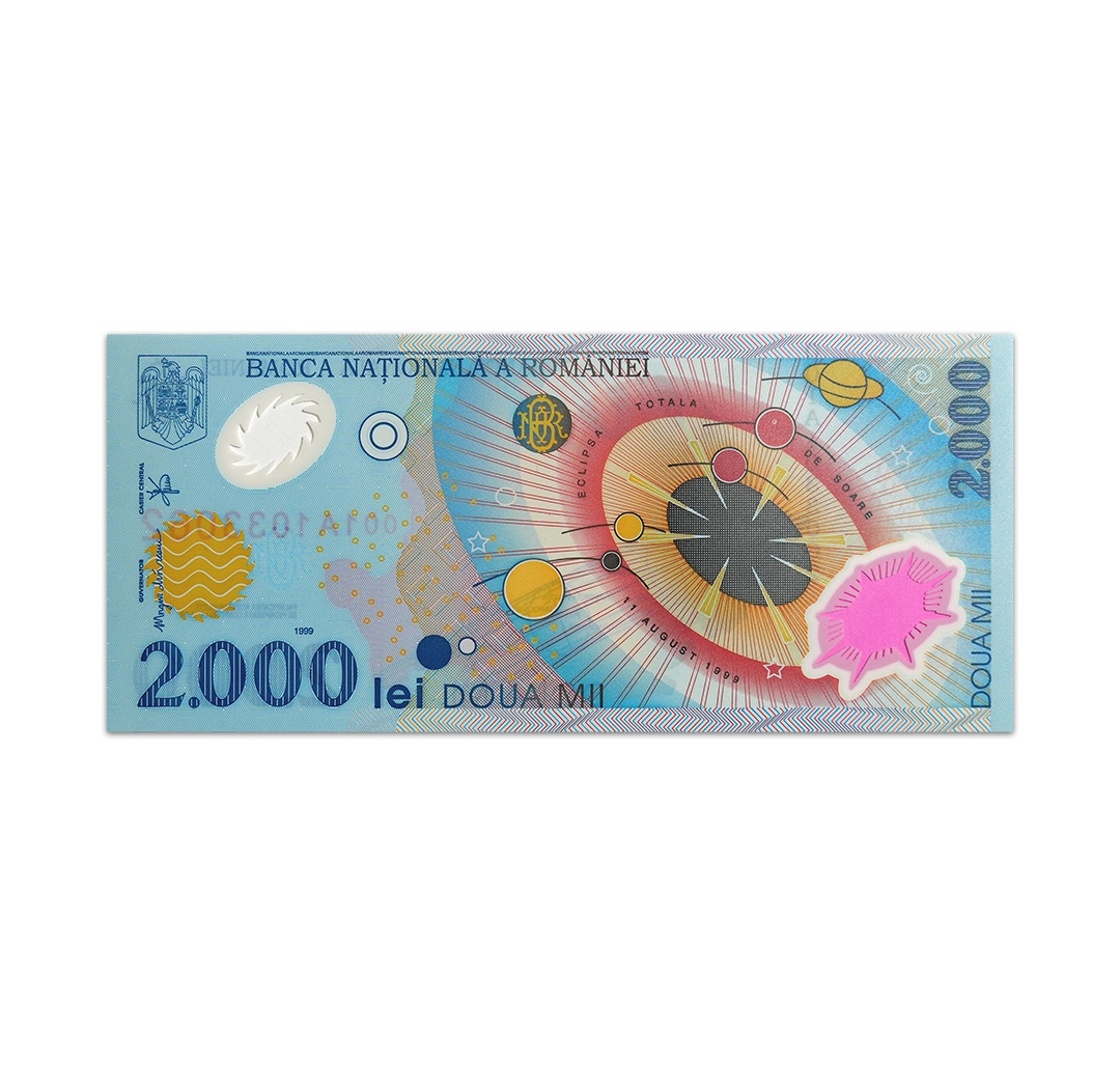 The 2,000 Romanian Lei Banknote from 1999 was issued to commemorate the total solar eclipse visible in Romania on August 11, 1999. Its obverse side features the solar system, a sun printed with metameric ink, a BNR monogram, and the coat of arms of Romania. The reverse side features a transit of total solar eclipse on August 11, 1999, over the map of Romania. The note is 143 x 63 mm in size and does not contain any security threads however when placed under a UV light, a shadow image of the BNR monogram is visible.