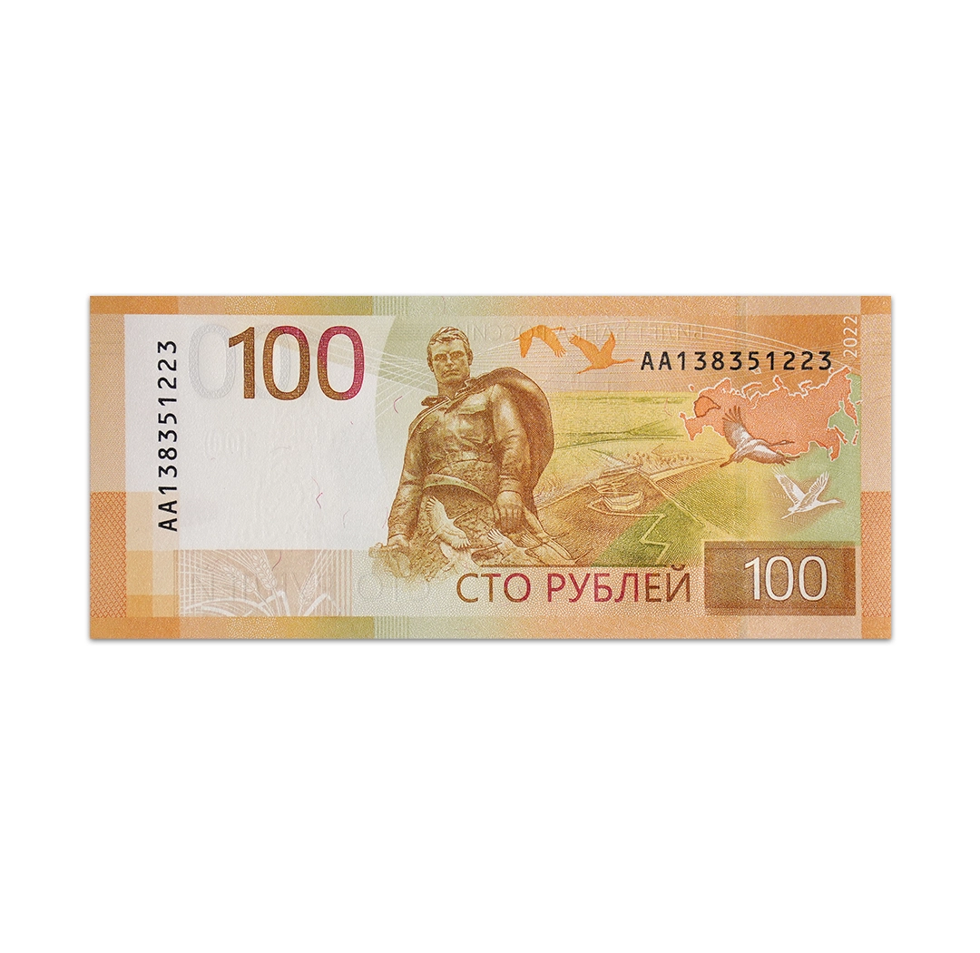This uncirculated 100 Russian ruble note is a standard circulation banknote issued by the Russia Bank. It is a tan note that is dated 2022 and measures 150 mm x 65 mm. Its obverse side features the Lomonossov University building, the Spasskiy Tower in Kremlin, the Zaryadye Concert Hall, and the Ostankino TV Tower. Its reverse side shows the Memorial to the Soviet Soldier in Rzhev and an aerial view of the Central Russia Region. Security features include a 2-mm wide windowed security thread with demetallized 100 and P and a watermark of Spasskaya Tower with an electrotype 100.
