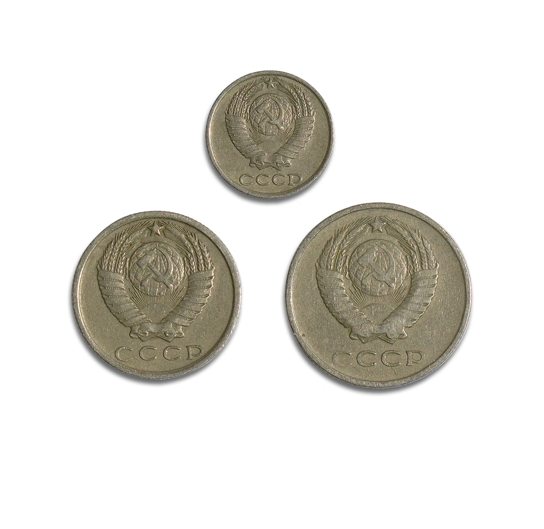 The 10, 15, and 20 Kopeck coins from the Soviet Union (USSR) were common circulation coins made of copper-nickel (or nickel brass) from the 1960s to 1990s, featuring the Soviet emblem (hammer & sickle, wheat sheaves with ribbons representing republics) on the obverse and the denomination on the reverse