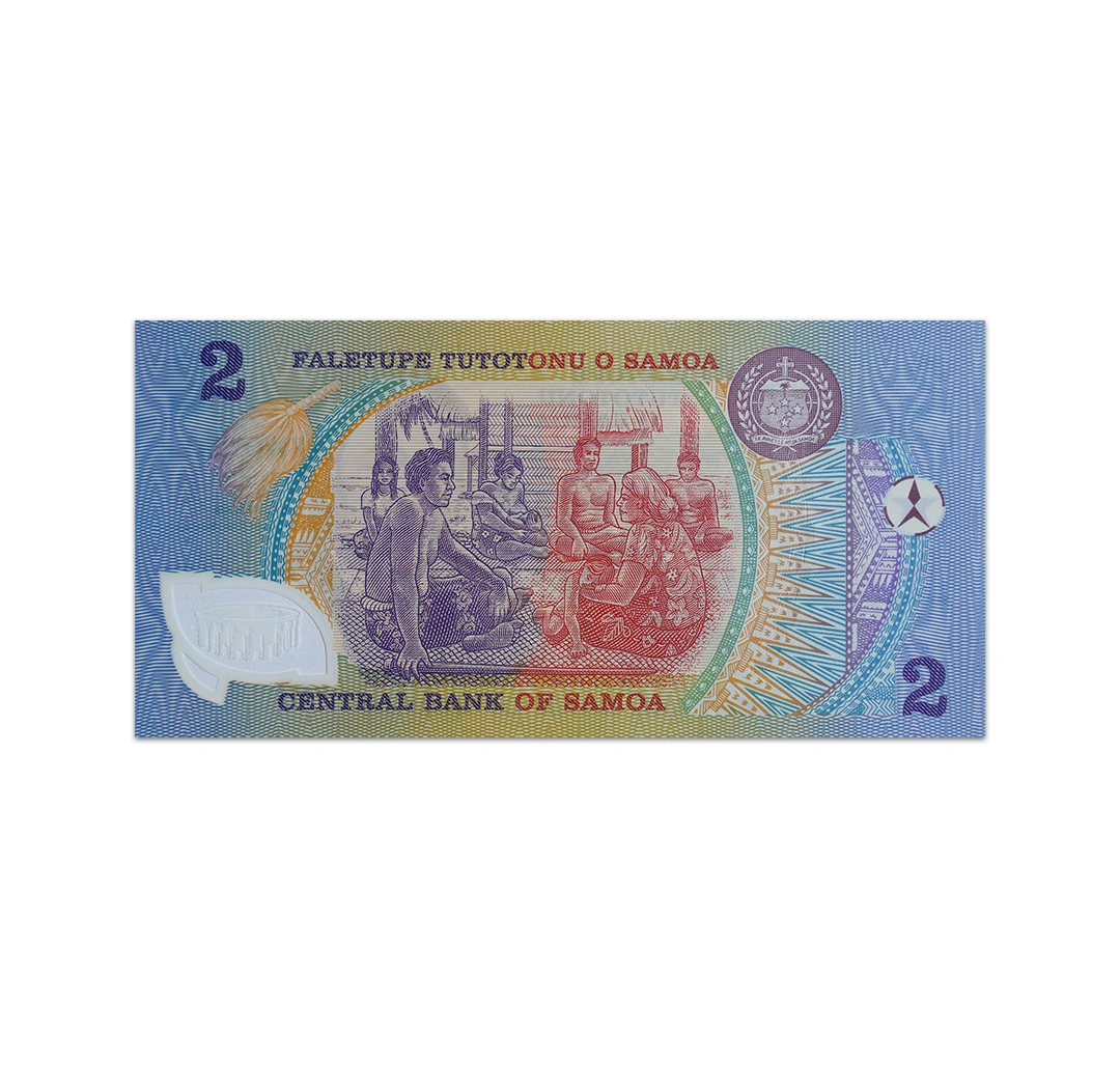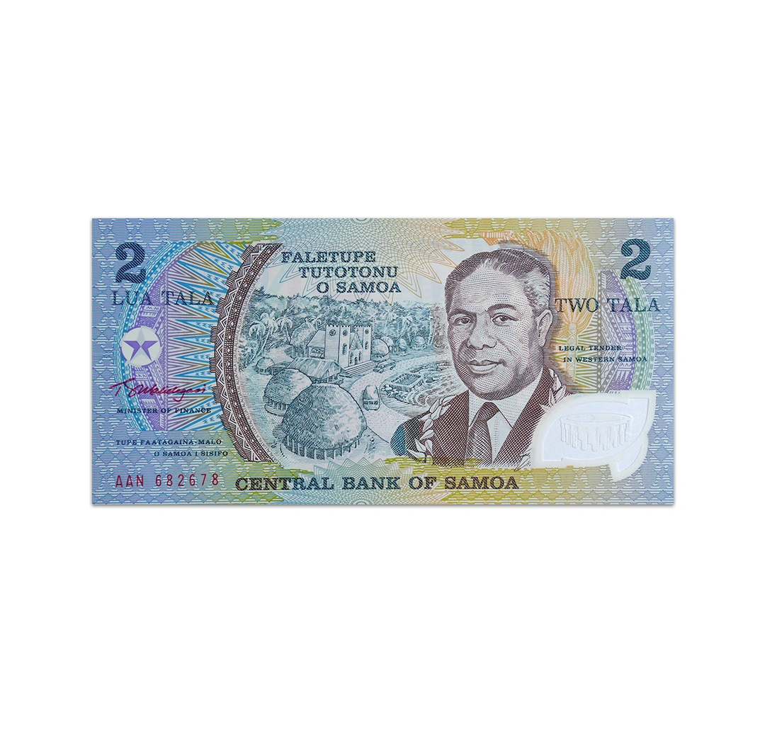 The 2 Samoan tala banknote, first issued in 1991, commemorates the Golden Jubilee of Malietoa Tanumafili IIs service as head of state. The 2 tala note is not only a commemorative bank note, but it is also the first polymer note issued by Samoa. The obverse features His Highness Susuga Malietoa Tanumafili II, with the village of Mulivai, the Immaculate Conception of Mary Cathedral in Apia, and buses on Beach Road in the background. The reverse side has a picture of a Samoan family gathered in a fale, a traditional Samoan house. There is a shadow image of the Samoan national flag, but no security thread. The 2003 banknote used intaglio printing. The note measures 140 mm by 70 mm.