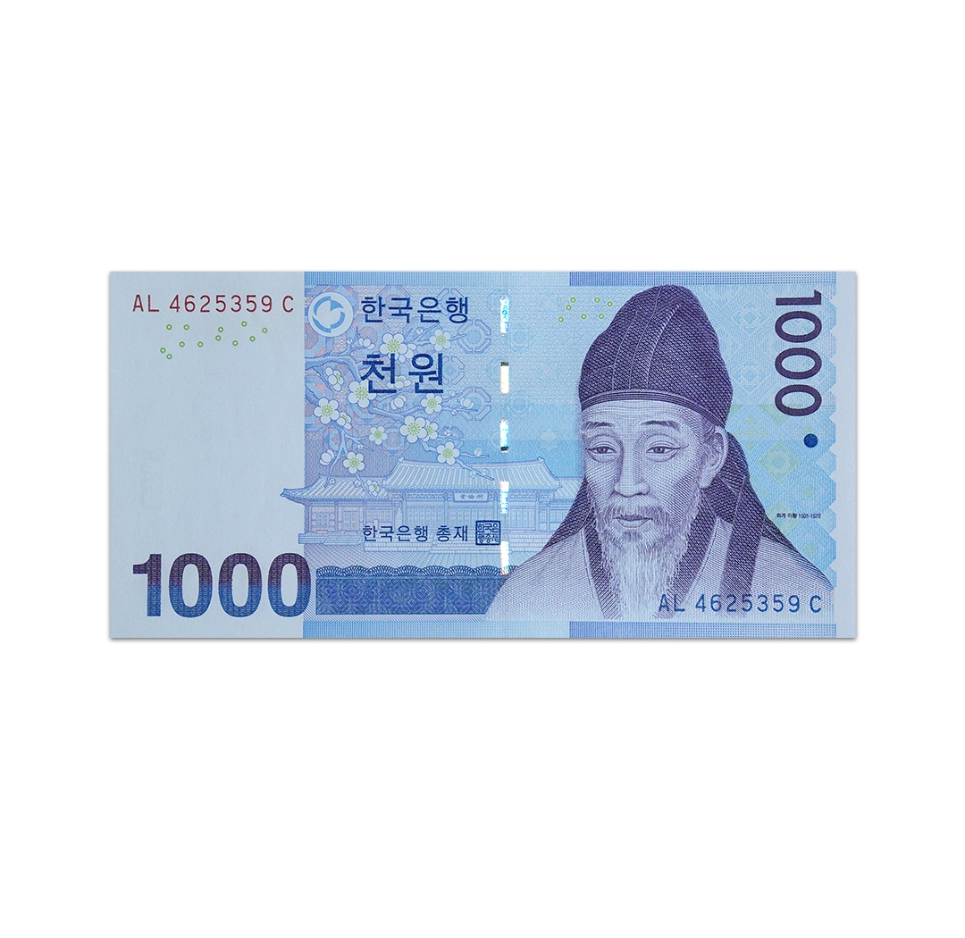 This uncirculated 1,000 South Korean won note was introduced in 2007. It is a blue, purple, and green note that measures 136 mm long and 68 mm wide. Its obverse side features a Japanese apricot tree branch and blossoms under the Myungryundang lecture hall building in Daegu and the Confucian scholar Toegye Yi Hwang. Its reverse side shows the Bank of Korea logo and a Gaesang junggeodo watercolor painting of a landscape. Security features include a windowed security thread, a t’aeguk (two-comma roundel) registration device, and a watermark of Toegye Yi Hwang with an electrotype 1000.