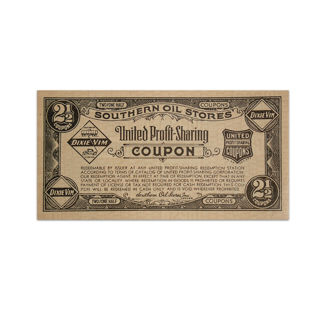 A genuine vintage profit-sharing coupon issued by Southern Oil Stores as part of the United Profit-Sharing program (circa 1930s–1940s). These paper coupons were historically distributed as trade-in rewards at Southern Oil gasoline stations and featured the “Dixie Vim” branding. Each coupon is denominated at 2½ cents and showcases classic early 20th-century border art and typography. Today, these coupons are collectible ephemera valued by gas & oil memorabilia enthusiasts and scrapbook/ephemera collectors.