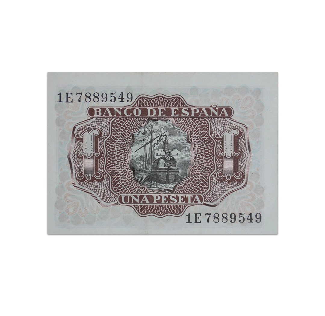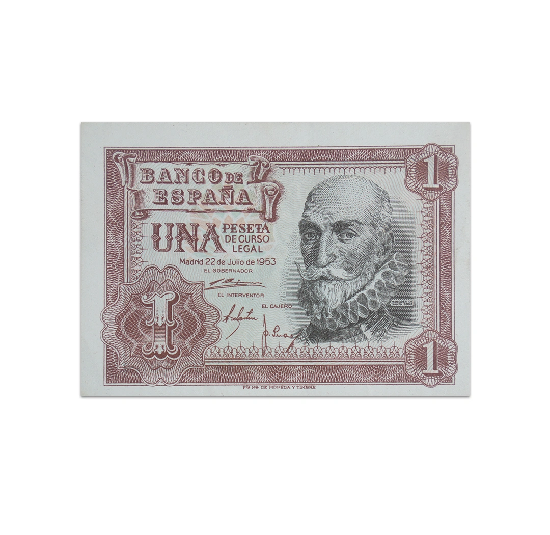 This 1 Peseta Spain note is a standard circulation banknote issued by the Bank of Spain. It is a brown, orange, blue, and black note that is dated 1953, bear the signatures of Joaquin Benjumea Burin, Martin Redrado and Joaquin Serrano Montero, and measures 85 x 60 mm. Its obverse side features Alvaro de Bazan. Its reverse side shows sailing ship at sea. The note does not have a security thread or watermark. Additionally, this note was withdrawn on 17 December 1971.