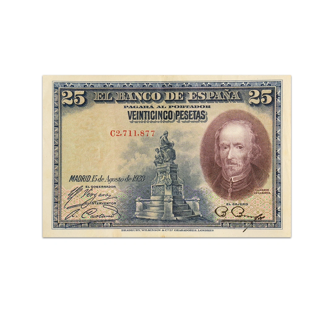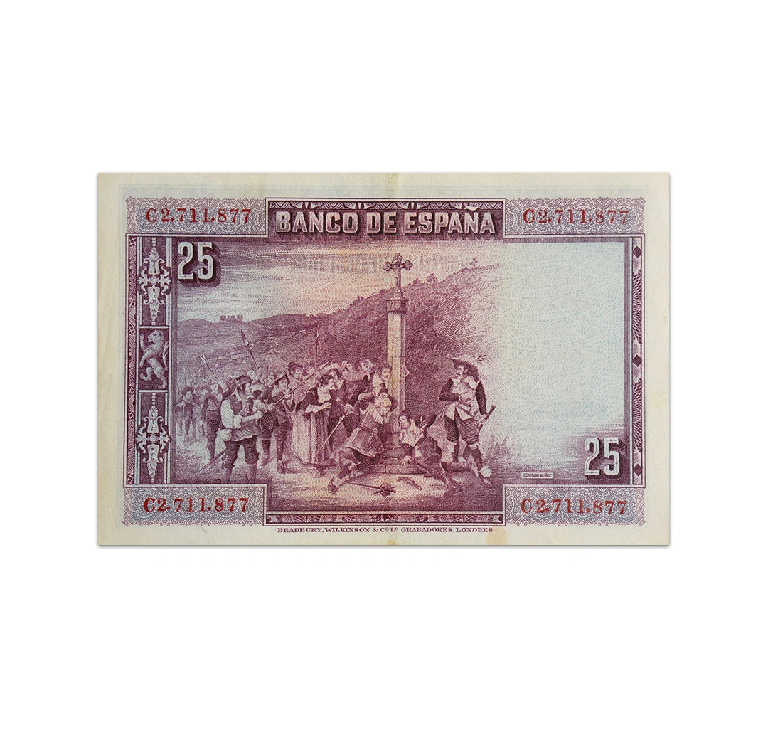 This 25 Pesetas Spain note is a standard circulation banknote issued by the Bank of Spain. It is a blue, green, orange, brown, and purple note that is dated 1928, bear the signatures of Adolfo Castano Orejon, Carlos Vergara Cailleaux and Bonifacio Burgos Delgado, and measures 121 x 81 mm. Its obverse side features de Barca monument in Plaza de Santa Ana, Madrid and Pedro Calderon de la Barca. Its reverse side shows Domingo Muñoz’s painting, “La devoción de la Cruz” (Devotion to the Cross). Though there is no security thread, there is still a watermark of the head of Venus.