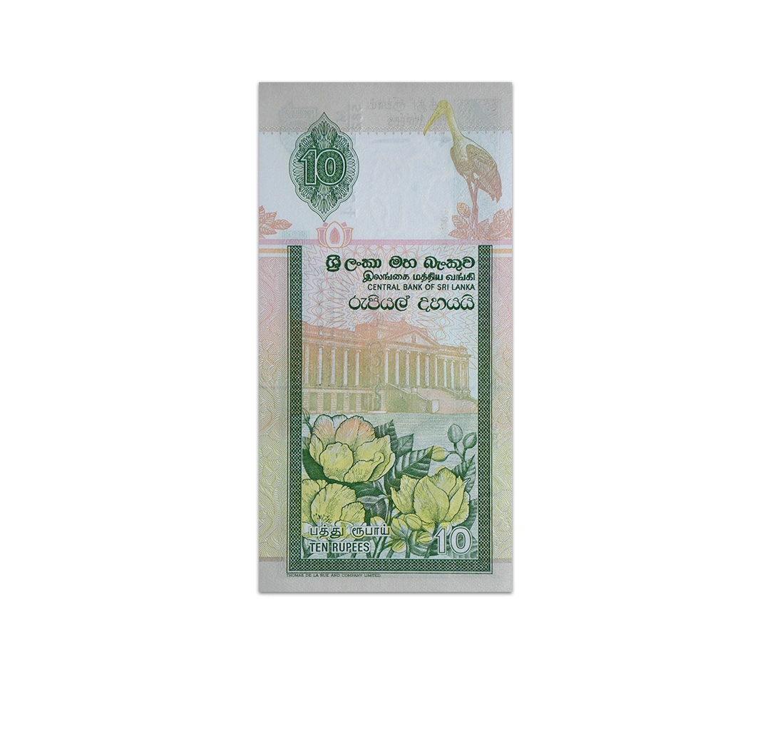 This uncirculated 10 Sri Lankan rupee banknote is a standard circulation banknote that is dated 03 July 2006 and signed by Mahinda Rajapaksa and Ajith Nivard Cabraal. It is a green and brown note that measures 122 mm x 60 mm. Its obverse side depicts a sculpture of a lion holding a whip in Yapahuwa. Its reverse side is vertically oriented and shows a painted stork, the Presidential Secretariat building in Colombo, and flowers. Security features include a solid security thread with printed CENTRAL BANK OF SRI LANKA RUPEES TEN and a watermark of a lion holding a whip with an electrotype sword.