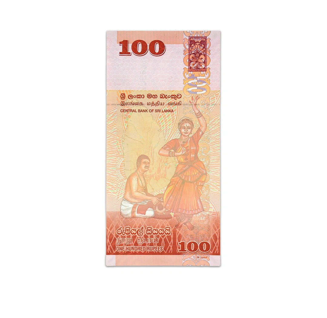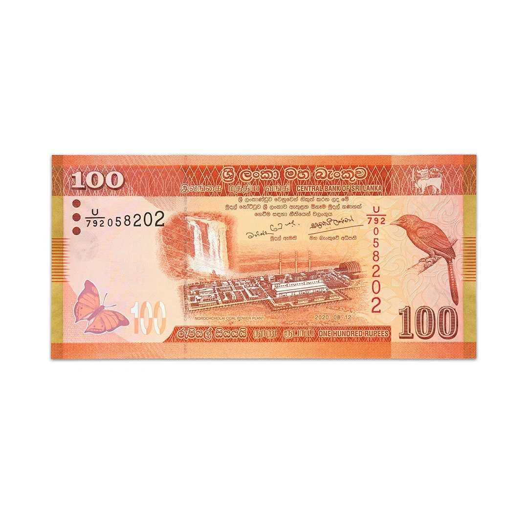This uncirculated 100 Sri Lankan rupee banknote is a standard circulation note issued by the Central Bank of Sri Lanka. The orange note, dated November 15, 2020, bears the signatures of Basil Rajapaksa and Ajith Nivard Cabraal and measures 138 mm x 67 mm. The obverse side features an autumn leaf butterfly, the Laxapana waterfall, the Norochcholai coal power plant, a Sri Lanka orange-billed babbler bird, and a lion holding a whip with a sword. The reverse side depicts a Mridangam drummer, a Bharatanatyam dancer, a Naga guard stone, and a stylized Dvithva liya vela floral motif. Security features include a solid security thread with "CBSL RS 100" printed on it and a watermark of a babbler bird with an electrotype 100 and Cornerstones.