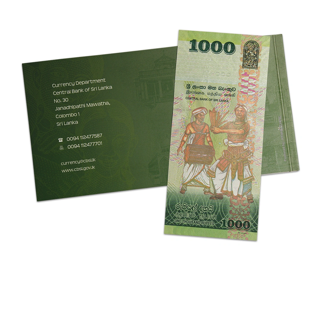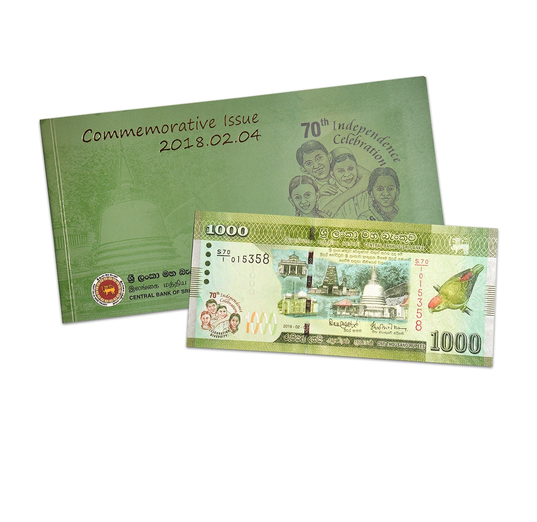 The Sri Lanka 1,000 Rupees Banknote with Folder was issued by the Central Bank of Sri Lanka in 2018 to commemorate the nation’s 70th Independence Celebration. The green banknote bears English, Sinhala, and Tamil texts. The obverse features the White Four Ring, a butterfly, a church, a mosque, Tamil Kovil, and a temple. It also shows a Sri Lanka hanging parrot and a lion holding a whip with a sword. The reverse depicts a Davul Bera drummer and a Malpadaya Netuma dancer, the guard stone of naga-raja holding a sprouting branch and a punkalasa (pot of plenty which is a symbol of prosperity), beneath a hood of cobra heads, with Sankha and Padma at its feet. It also shows a stylized Dvithva liya vela floral motif. The banknote has a 2.5-mmm wide red-to-green StarChrome windowed security thread with a demetallized CBSL RS 1000. Its watermark reveals a parrot with an electrotype 1000 and Cornerstones. The banknote is 148 x 67 mm in size. This commemorative banknote is in uncirculated condition.
