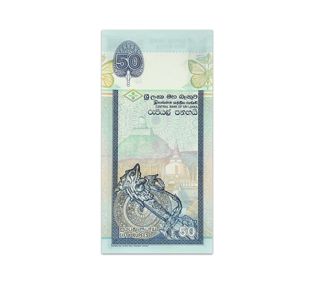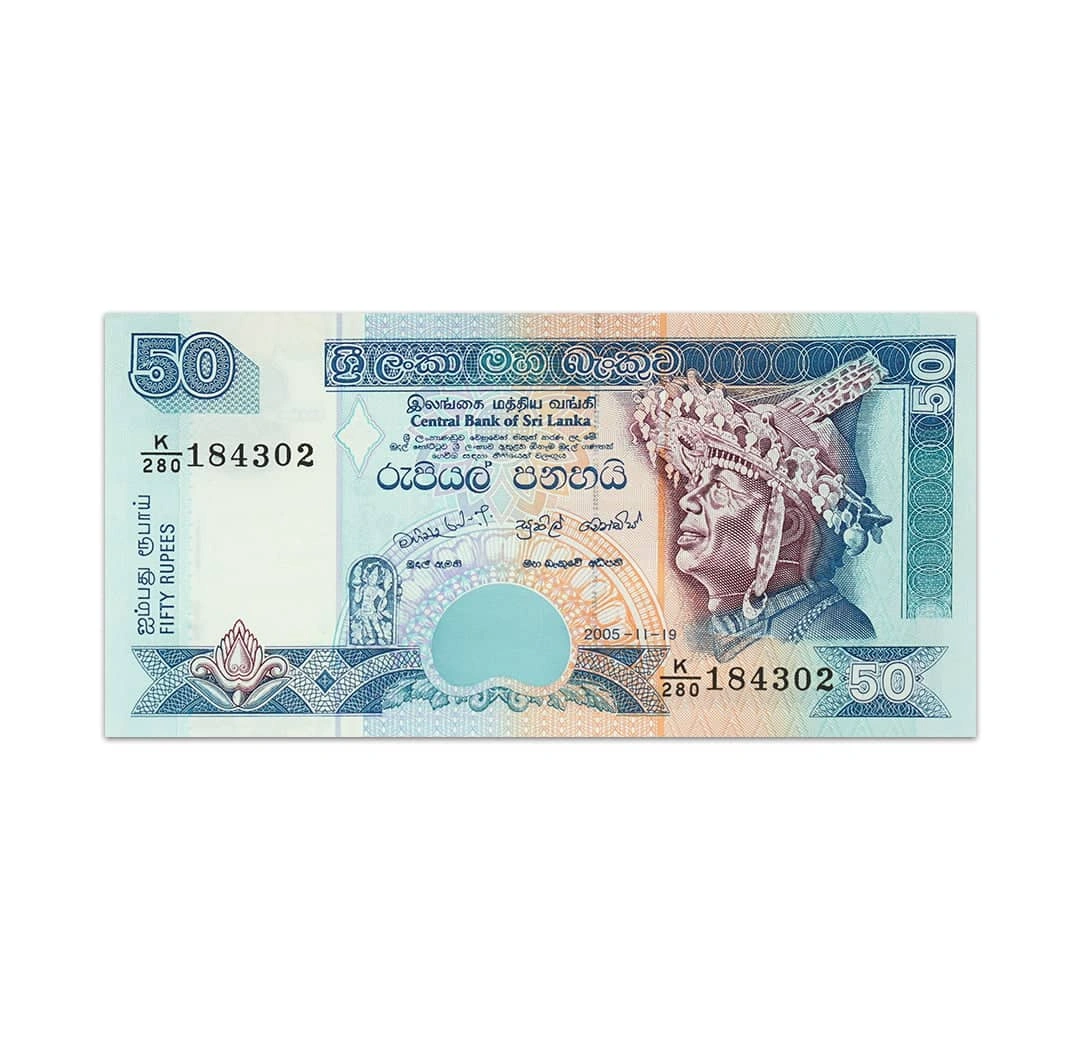 The Sri Lanka 50 Rupees banknote was issued by the Central Bank of Sri Lanka in 2005. It features a color combination of blue and green and includes texts in English, Sinhala, and Tamil. The obverse side depicts a Kandyan dancer with an ornate headdress. The reverse side is vertically oriented and includes butterflies, the Jetavan and Thuparama stupas in Anuradhapura, a shield, and an ornamental sword. Security features of the note include a solid security thread with "CENTRAL BANK OF SRI LANKA RUPEES FIFTY" printed on it and a watermark that shows a lion holding a whip with an electrotype sword. The banknote measures 136 mm x 68 mm and bears the signatures of Mahinda Rajapaksa and Ajith Nivard Cabraal. This particular banknote is in uncirculated condition.