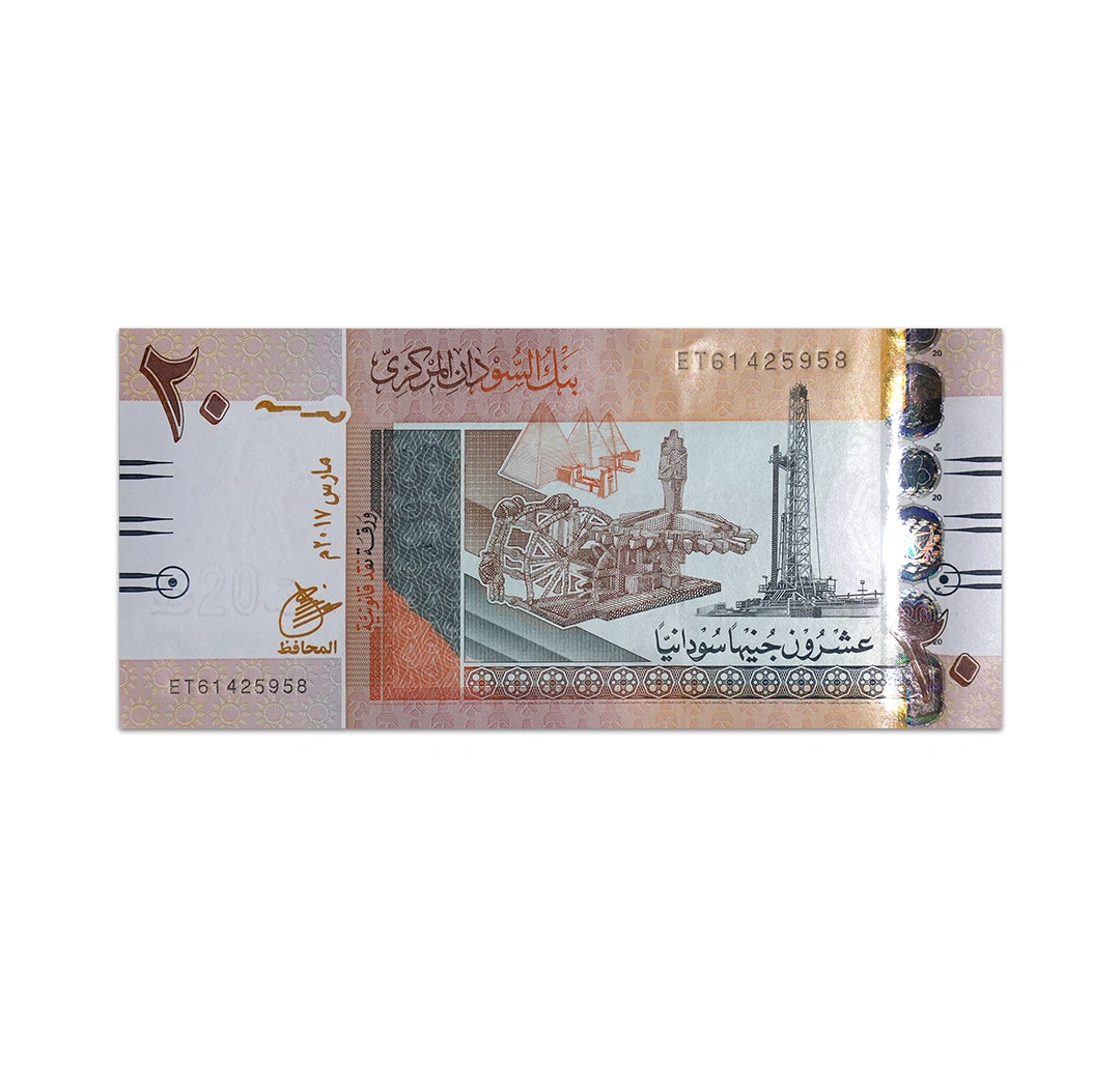 Sudan 20 Sudanese Pounds Banknote was released by the Central Bank of Sudan in 2017. It has a color combination of tan, orange, and purple. Its obverse features an industrial development theme with three Nubian pyramids at Meroe, an irrigation wheel, and an oil drilling platform. The refers depicts the bank logo, a factory, satellite dishes, and fruit including bananas, papayas, flowers, pineapple, citrus, grapes, and corn. The banknote contains a holographic stripe and a 2-mm wide window security thread with demetallized CBS 20 LS and Arabic text. It also has a watermark that reflects a secretary bird and an electrotype LS 20. It measures 160 x 74 mm and is signed by Hazim Abdegadir Ahmed Babiker. This particular banknote is in used condition.