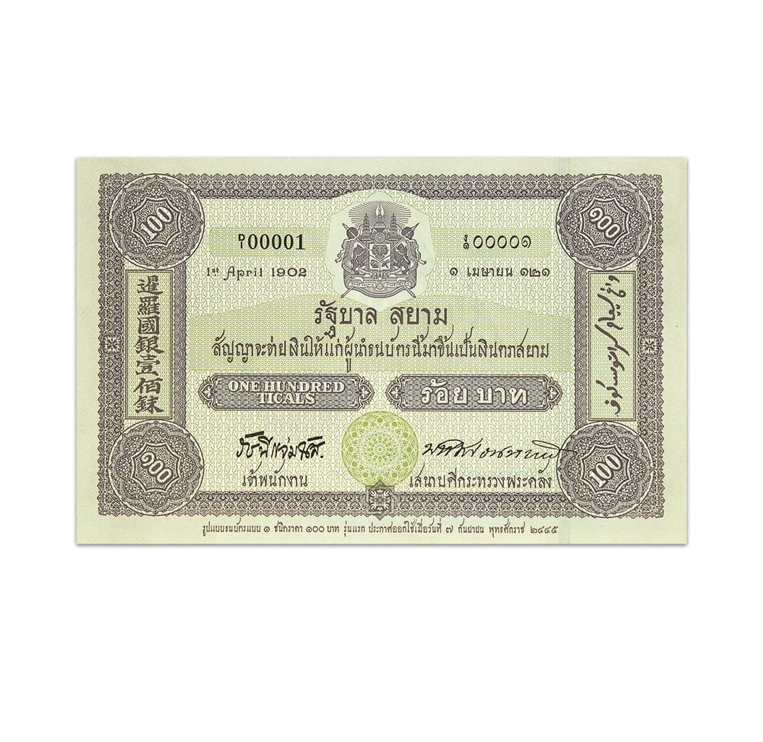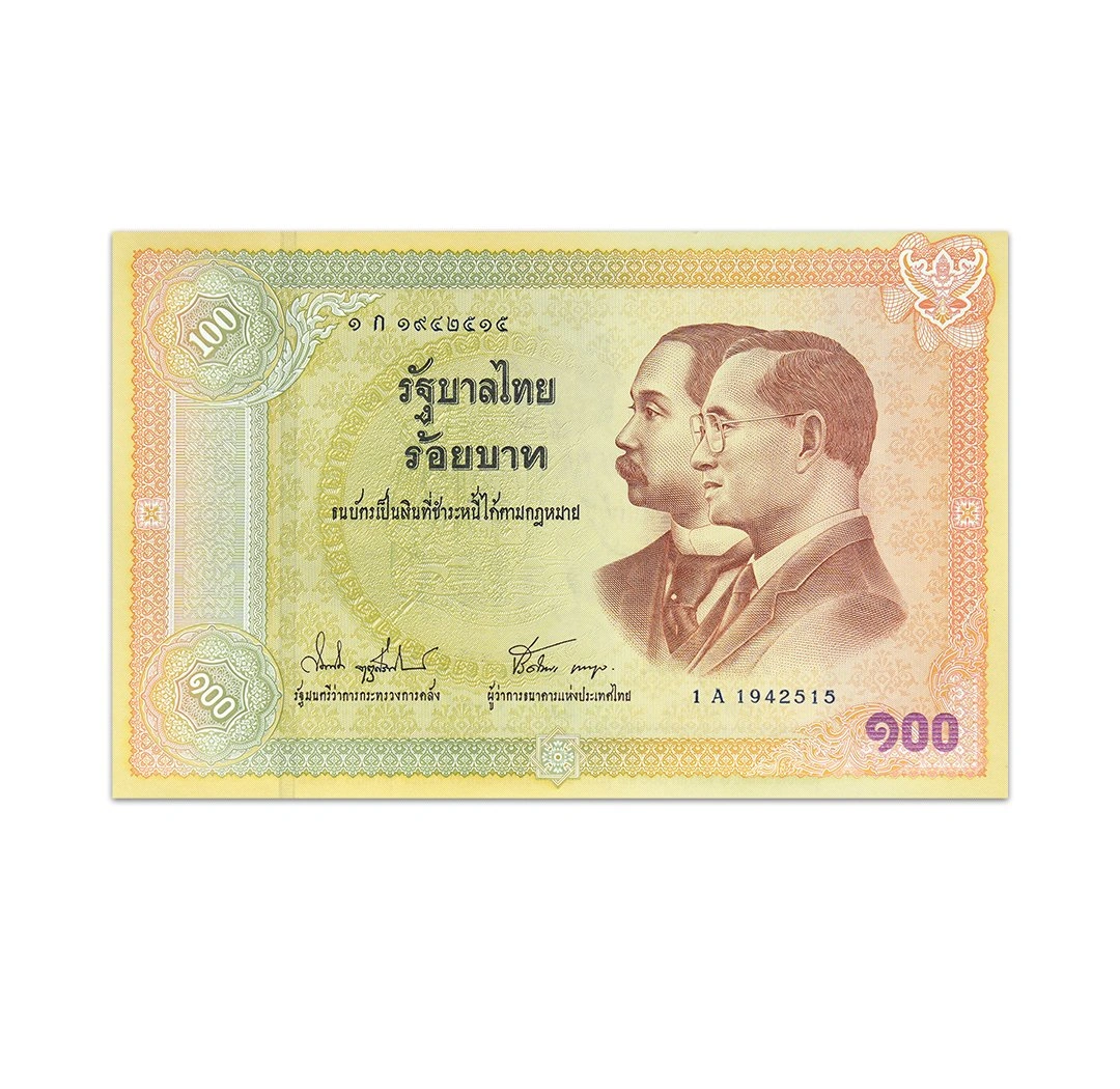 The Thailand 100 Baht banknote was issued by the Government of Thailand in 2002 to commemorate the centenary of Thai banknotes. The banknote is in a combination of gold, brown, green, and black. The obverse of the paper bill features Kings Rama V and Rama IX and the Royal Garuda emblem. The reverse depicts the facsimile of a 100-tical note dated 1st April 1902. The banknote is 165 x 105 mm in size and bears a solid security thread with a demetalized Arabic text. It also carries a watermark that reflects Airapote which is a 3-headed elephant. This commemorative banknote is in uncirculated condition.