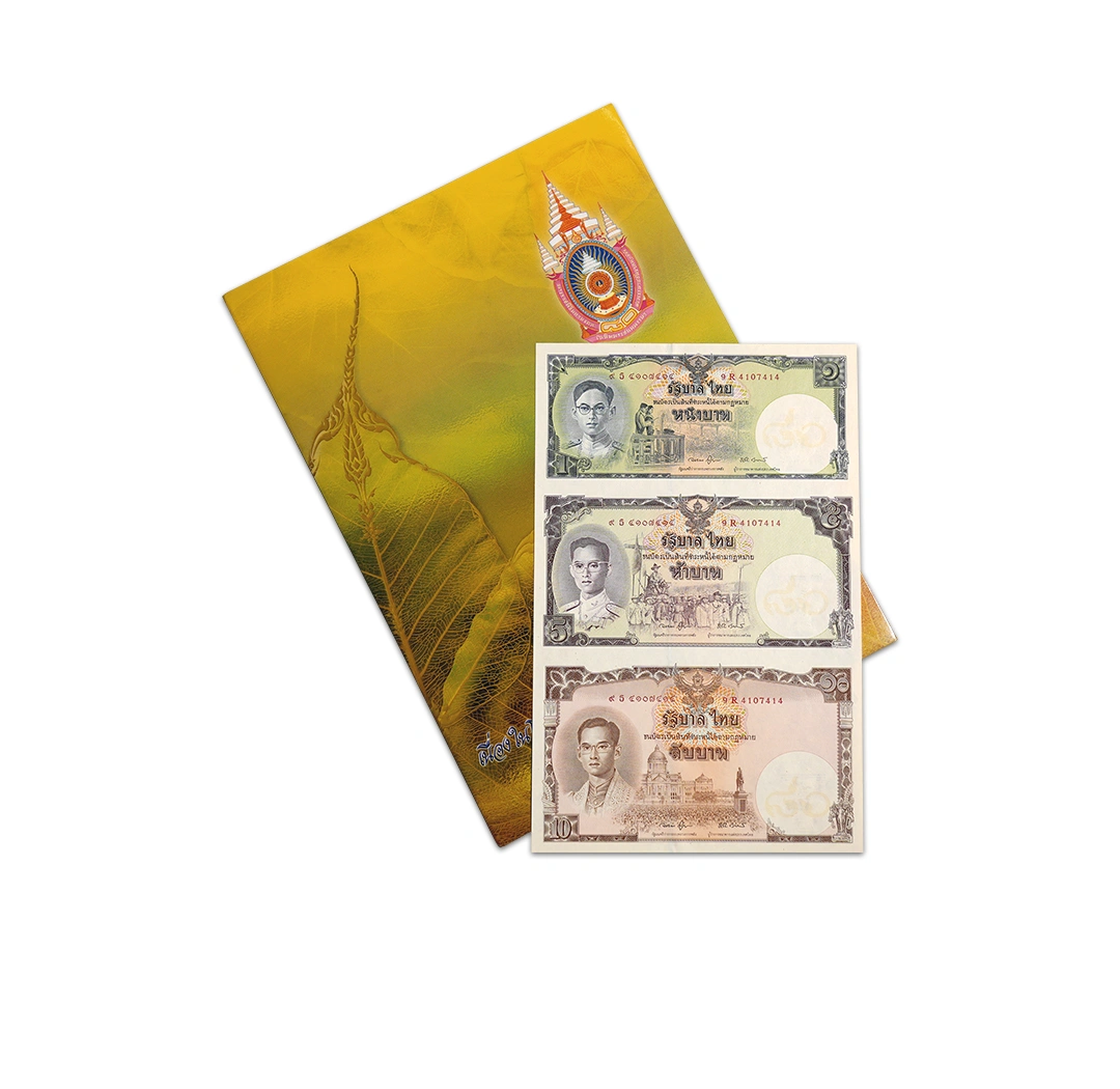 The Thailand 16 Baht banknote is part of the 2007 issues. Each note measures 147 229 mm. The obverse side of the 1 Baht features a portrait of His Majesty King Bhumibol Adulyadej, the Royal Garuda Emblem, and the Airapote elephant, Portrait of Their Majesties granting an audience to various groups of people who paid their tribute to His Majesty on the occasion on his coronation in 1950 at the Sutthaisawan Prasat Hall; the 5 Baht features a portrait of His Majesty King Bhumibol Adulyadej, the Royal Garuda Emblem, and the Airapote elephant, Portrait of His Majesty in a royal procession by land, marking his 3rd Cycle Birthday Anniversary in 1963; and the 10 Baht features a portrait of His Majesty King Bhumibol Adulyadej, the Royal Garuda Emblem, and the Airapote elephant, Portrait of His Majesty granting an audience to various groups of people who paid tribute to His Majesty on the Auspicious Occasion of the 60th Anniversary Celebrations of His Majesty's Accession to the Throne in 2006 at the Ananda Samakhom Throne Hall. The reverse side of the 1 Baht features a portrait of His Majesty's childhood, the portrait of Their Majesties King Rama VIII and King Rama IX on their return to Thailand in 1945, the portrait of His Majesty during his study in Switzerland, the Royal Emblem in Commemoration of the Celebrations on the Auspicious Occasion of the His Majesty the King's 80th Birthday Anniversary 5th December 2007, the Royal Garuda Emblem, and the Temple of the Emerald Buddha and the Grand Palace, and the Villa Vadhana in Switzerland.