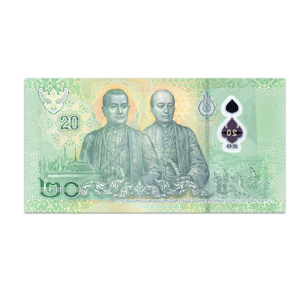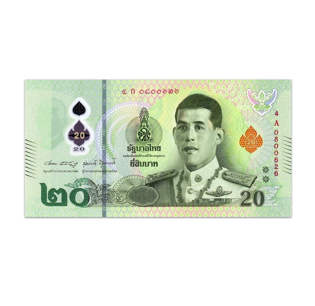 The Thailand 20 Baht Banknote was issued by the Central Bank of Thailand in 2022, printed on polymer. The obverse depicts King Vajiralongkorn, Rama X, wearing the uniform of the Commander of the Royal Thai Air Force. The reverse of the banknote depicts King Rama I Phra Buddha Yodfa Chulaloke and the Grand Palace. It also shows King Rama II, Phra Buddha Loetla Nabhalai, and a Thai mural of a scene from Enau. The note contains a simulated security thread with demetalized 20 BAHT and a watermark that reveals a shadow image of King Rama X. The note is 138 x 72 mm in size and is signed by Arkhom Termpittayapaisith and Dr. Sethaput Suthiwartnarueput. This particular polymer banknote is in uncirculated condition.