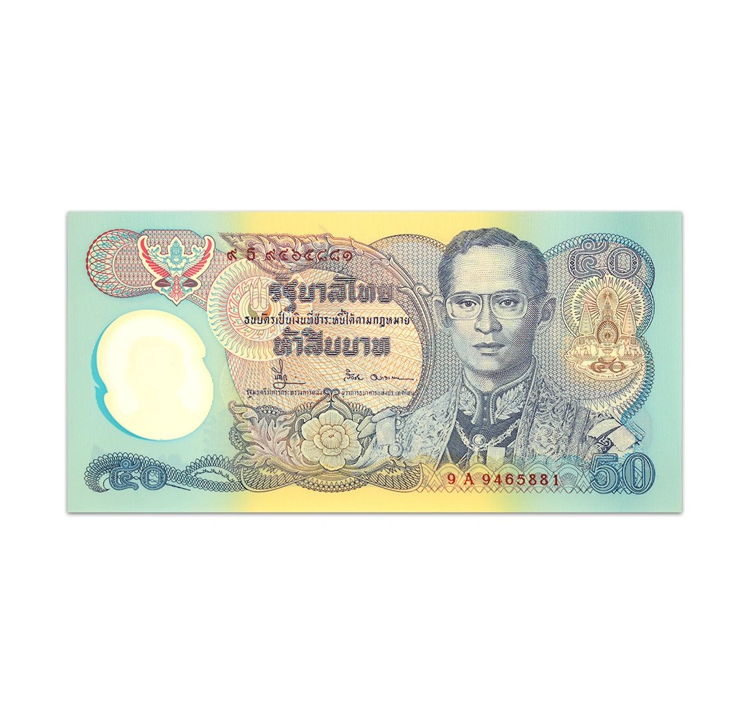 The Thailand 50 Baht banknote was issued by the Government of Thailand in 1996 to commemorate the 50th anniversary of Rama IX’s accession to the throne on June 9, 1946. The obverse of this blue banknote features Bhumibol Adulyadej in a uniform, the Royal Garuda emblem, the emblem of the Chakri Dynasty depicting a chakra (discus) and a trisula (trident), and the royal ceremonial emblem of the Golden Jubilee with a crown flanked by elephants. The reverse side depicts the coat of arms of Thailand, the signature of Rama VII, the Ananta Samakhom Throne Hall within the Royal Dusit Palace in Bangkok, the statue of a seated Rama VII modeled after the monument in front of the National Parliament building in Bangkok, and the Royal Garuda emblem. The note does not contain a security thread but bears a watermark with a shadow image of Rama IX. It measures 144 mm x 72 mm and is printed on polymer. This commemorative banknote is in uncirculated condition.