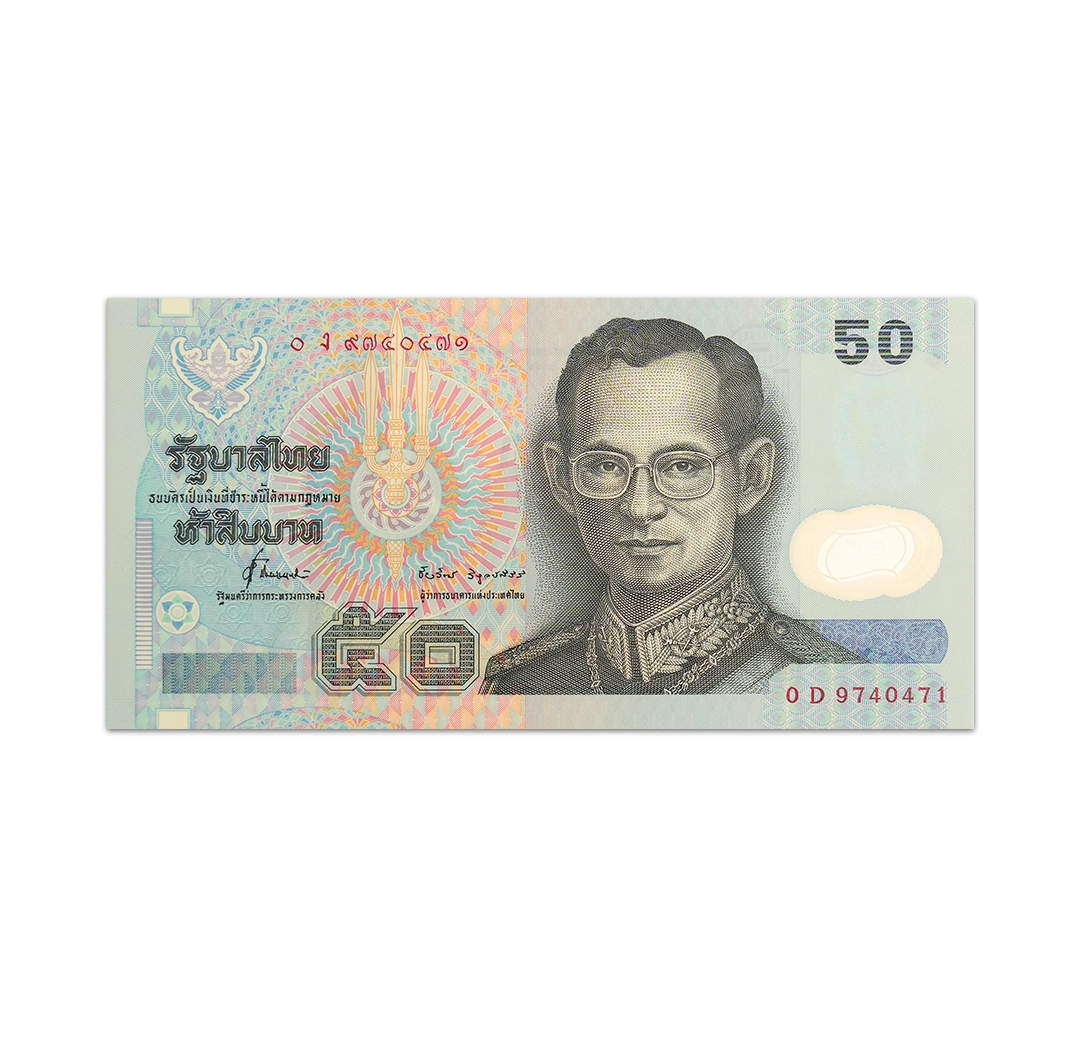 This uncirculated 50 Thai baht banknote is a standard circulation banknote introduced by the Government of Thailand in 1997. It is a blue and pink polymer banknote that bear the signatures of Somkid Jatusripitak and Pridiyathorn Devakula, and measures 142 mm x 72 mm. Its obverse side shows King Bhumibol Adulyadej (Rama IX) in a Field Marshall’s uniform. Its reverse side shows a celestial globe, King Rama IV, and a Phra Pathom Chedi. Though the banknote does not have a security thread, it has a watermark of Rama IX.