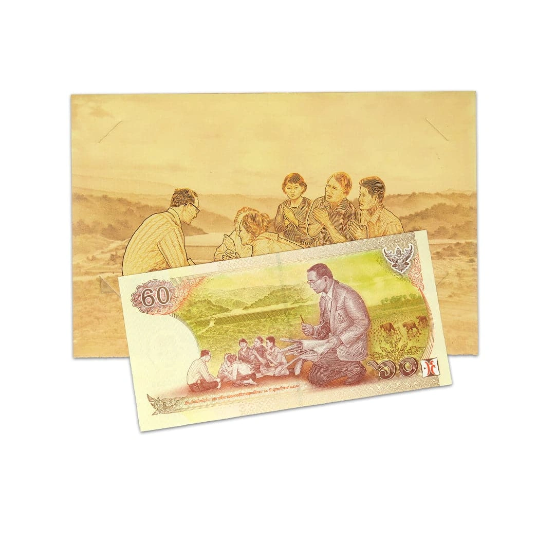 This folder and card contain one commemorative banknote from Thailand. The uncirculated 60 Thai baht banknote commemorates the 60th anniversary of the accession of Rama IX to the throne on 9 June 1946. It is a gold, brown, and green note that measures 162 mm x 81 mm and bears the signatures of Thanong Bidaya and Pridiyathorn Devakula. Its obverse side depicts the royal seal and a seated Bhumibol Adulyadej (Rama IX) wearing his military uniform and the Chakri Dynasty royal robe with the Victory crown and royal regalia. Its reverse side depicts a seated Rama IX with five subjects, a dam, a squatting Rama IX with a map, and farmers in a paddy. Security features include a solid security thread with a demetalized Thai text and a Rama IX watermark.