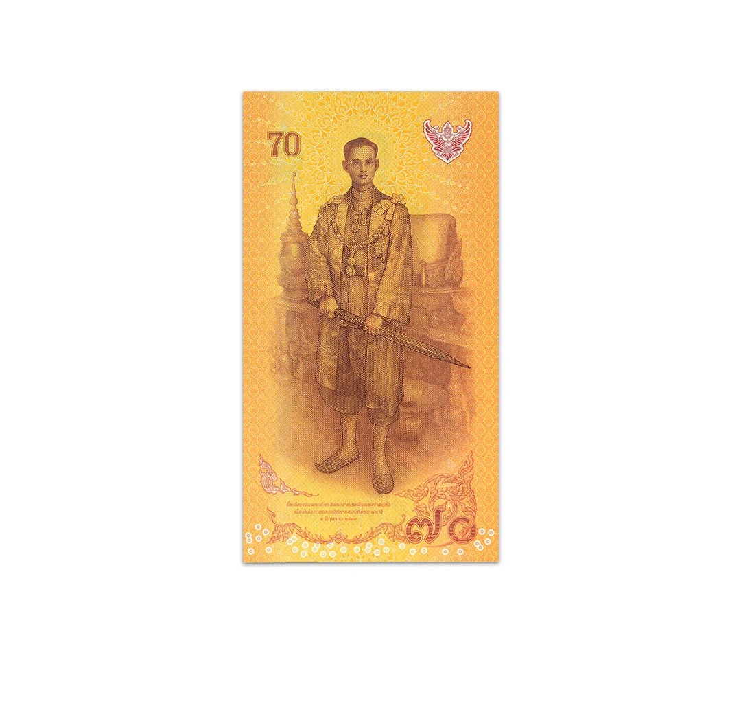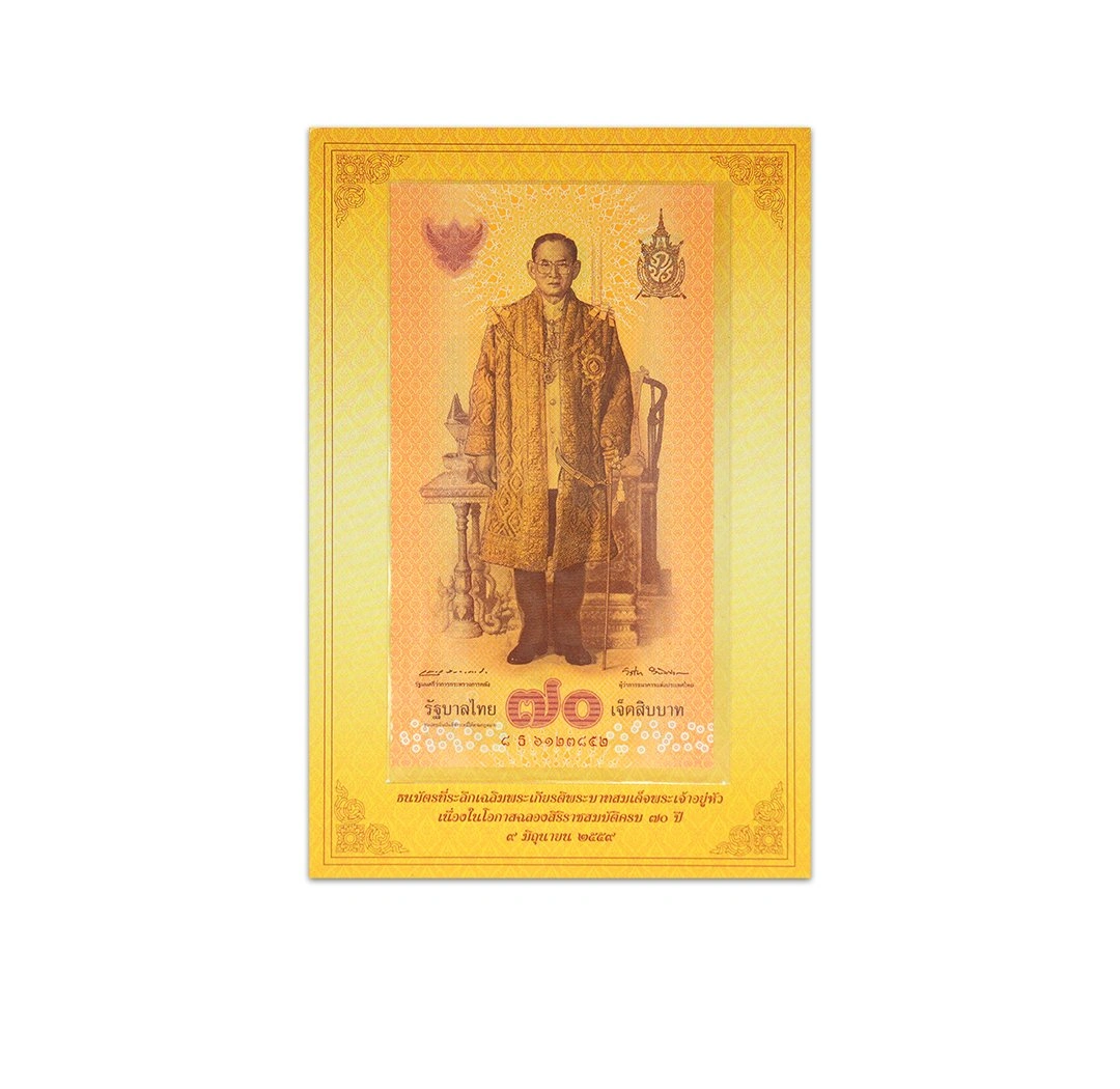 The 2016 Thailand 70 Baht Banknote was a special issue in commemoration of the 70th anniversary of King Bhumibol Adulyadej’s accession to the throne. The banknote is in a vertical orientation and is predominantly gold with hints of brown and red. The obverse side features King Bhumibol Adulyadej in full royal regalia which included the Most Illustrious Order of Chula Chom Klao breast chain, and right beside him, the Royal Garuda emblem as registration device. The reverse side shows the young King in full regalia holding the Sword of Victory, with the Phuttan Kanchanasinghat Throne in the background. The banknote is 89 x 162 mm in size and is signed by Apisak Tantivorawong and Veerathai Santiprabhob. This commemorative banknote is in uncirculated condition and comes in a card holder.