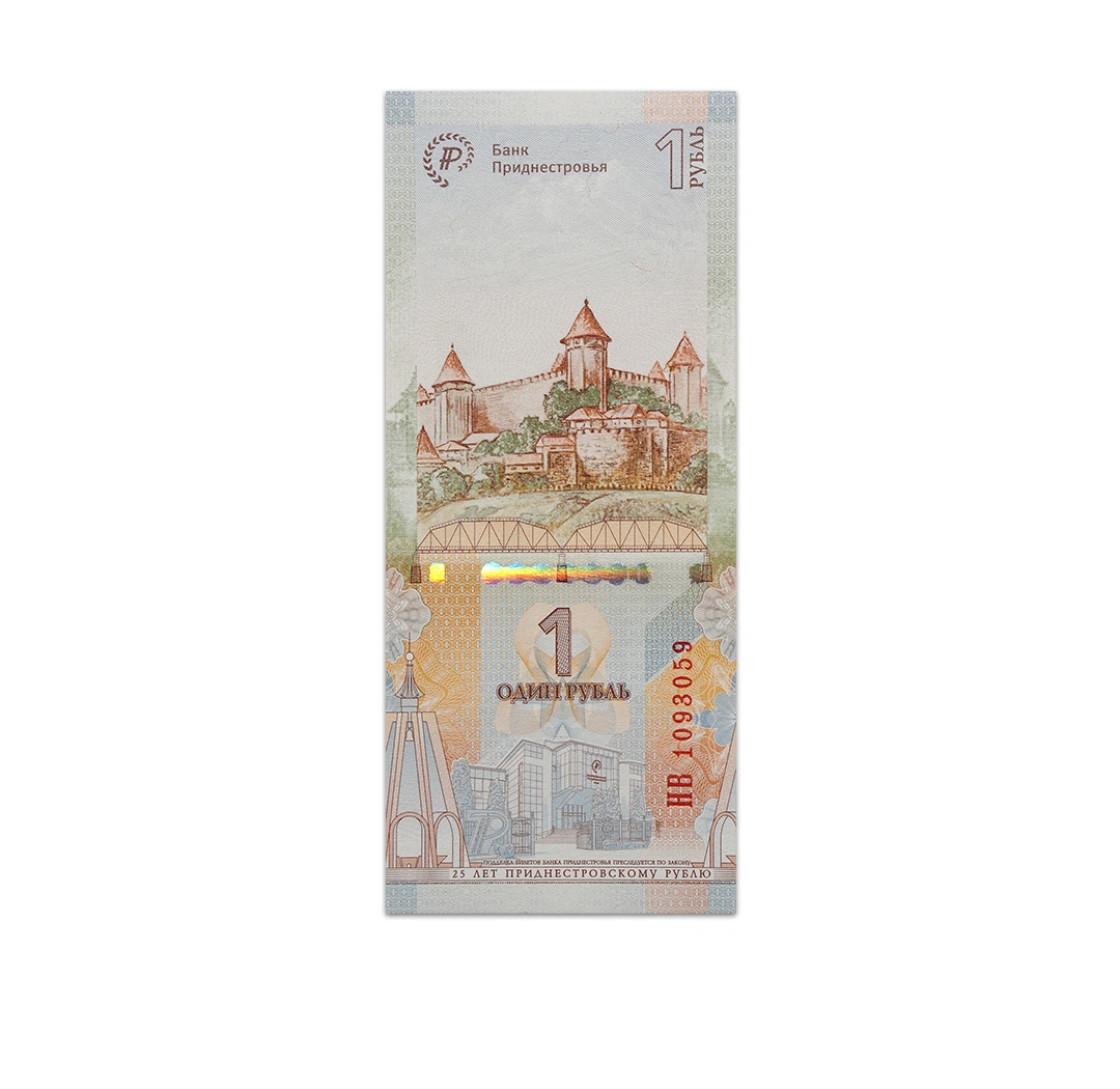 This 1 Trans-Dniester ruble note is a commemorative banknote issued by the Trans-Dniester Republican Bank to celebrate the 25th anniversary of the Trans-Dniester ruble. It is a brown green, orange, blue, and red note that is dated 2019 and measures 129 mm x 56 mm. Both sides of the note are vertically oriented. Its obverse side features Alexander Suvorov. Its reverse side shows the Bendery Fortress, a stylized bridge between the two banks of the Dniester River, a stylized open-chapel monument memorializing the 1992 Bendery tragedy, and the modern building of the Transnistrian Republic Bank. Security features include a winged security thread and a watermark of Alexander Suvorov with an electrotype ПРБ.