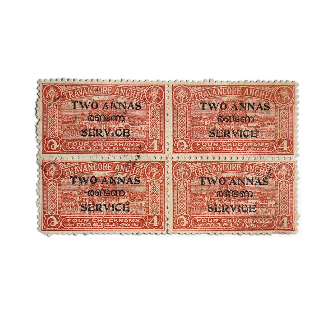 Travancore Anchel Service 2 Annas 1949 Block of 4 Stamps