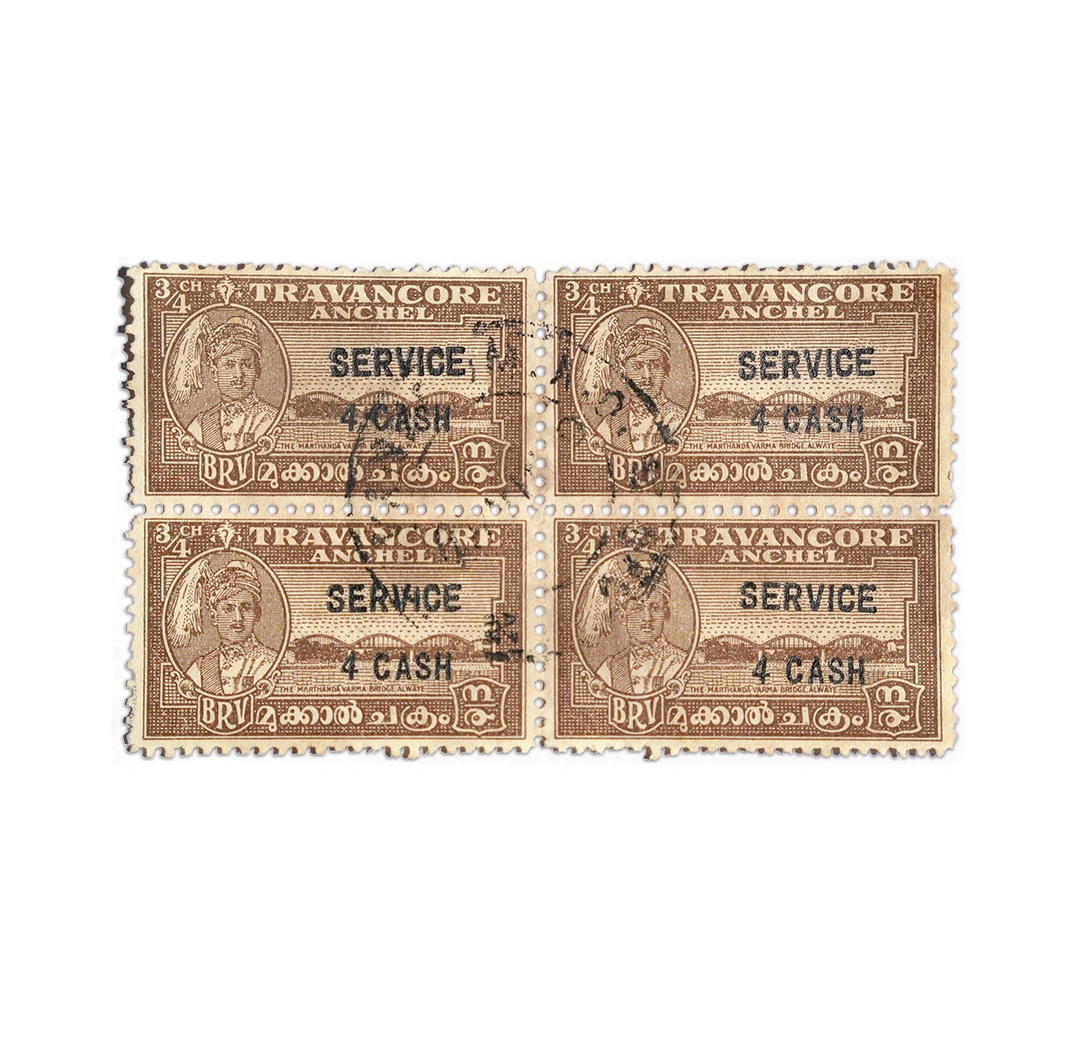 Travancore Anchel Service 4 Cash 1942 Block of 4 Stamps