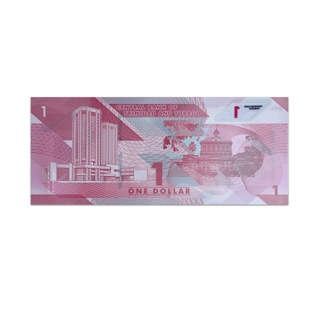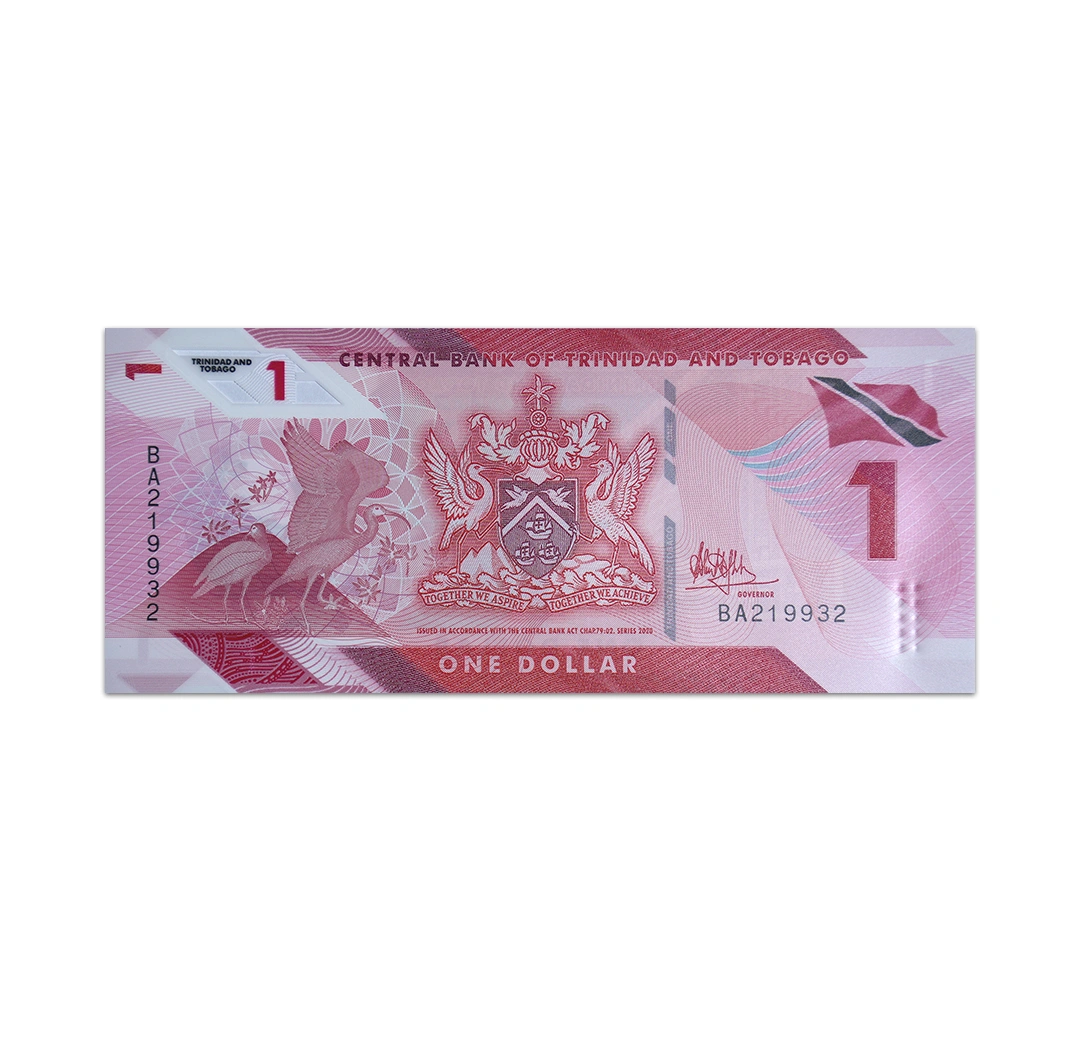 This uncirculated 1 Trinidad and Tobago dollar note is dated 2020 and signed by Dr. Alvin Hilaire. It is a red polymer note. Its obverse side features scarlet ibis birds, the flag, and the national emblem. Its reverse side shows a view of the Central Bank building, the Parliament building (also known as the “Red House”), and the Port of Spain. Because the note is made of polymer, it does not have a watermark. However, it has a simulated windowed security thread and dimensions of 156 mm x 66 mm.