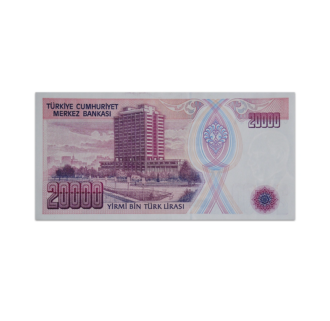 The Turkey 20,000 Lira banknote is part of the family of notes released between 1970 and 1995 by the Central Bank of Turkey. The banknote has claret red and violet color combinations. Its front design depicts Mustafa Kemal Ataturk who served as president of the newly reformed Turkish republic. On the back of the banknote is the Central Bank headquarters building in Ankara. The banknote was printed by TCMB and is 152 x 76 mm in size. It carries a windowed security thread and a watermark that portrays Mustafa Kemal Ataturk.