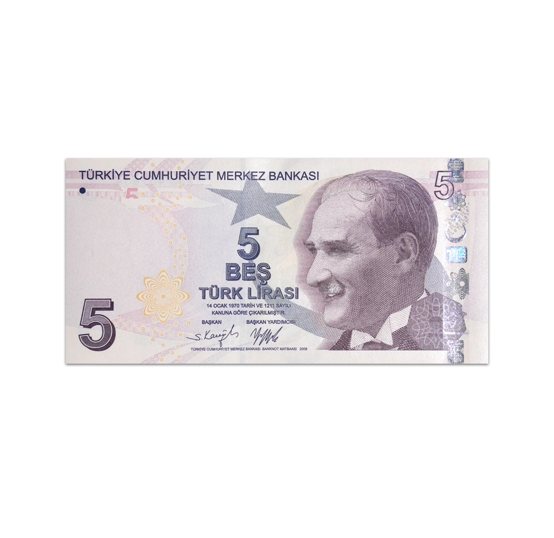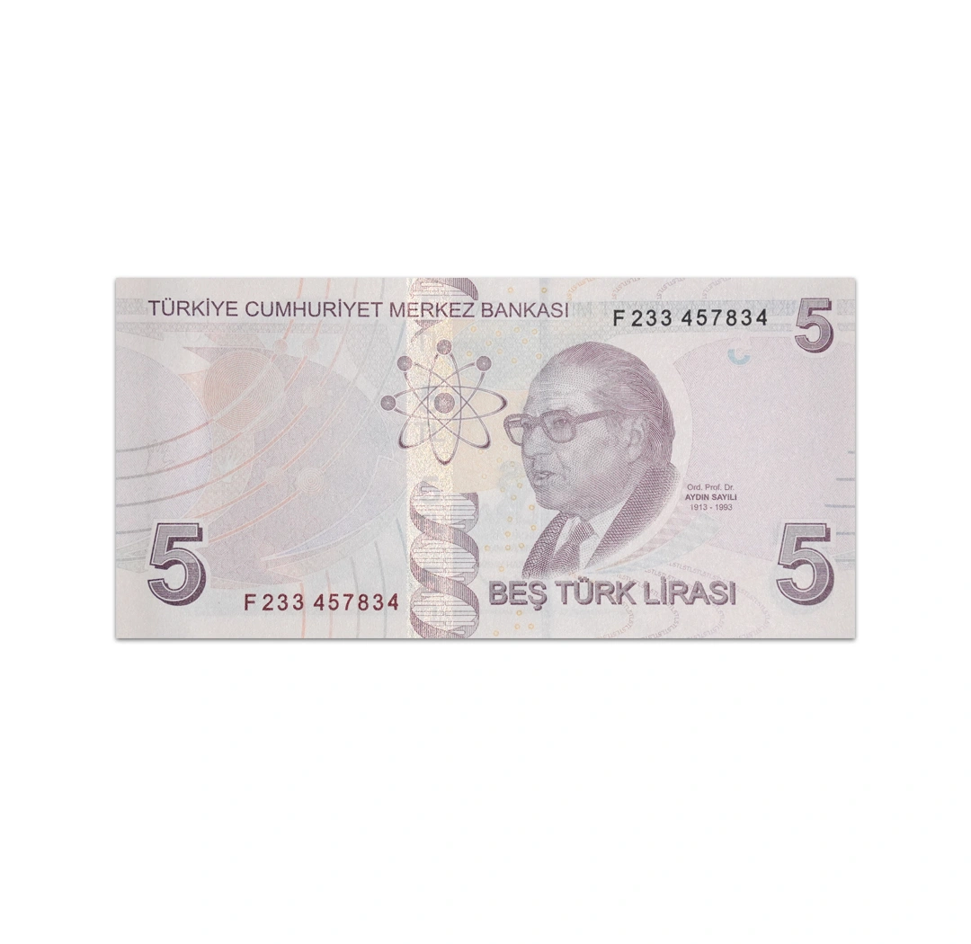 This uncirculated 5 Lira Turkey note is a standard circulation banknote issued by the Central Bank of Turkey. It is a tan note that is dated L.1970 (2009), bear the signatures of Taha Cakmak and Dr. Sahap Kavcioglu, and measures 130 x 64 mm. Its obverse side features a star, Mustafa Kemal Ataturk, star and crescent. Its reverse side shows open hands, planets, atom, double helix DNA chain, science historian Aydın Sayılı and Holographic stripe. Security features include a solid security thread with printed TL 5 and a watermark of Mustafa Kemal Ataturk and electrotype 5.