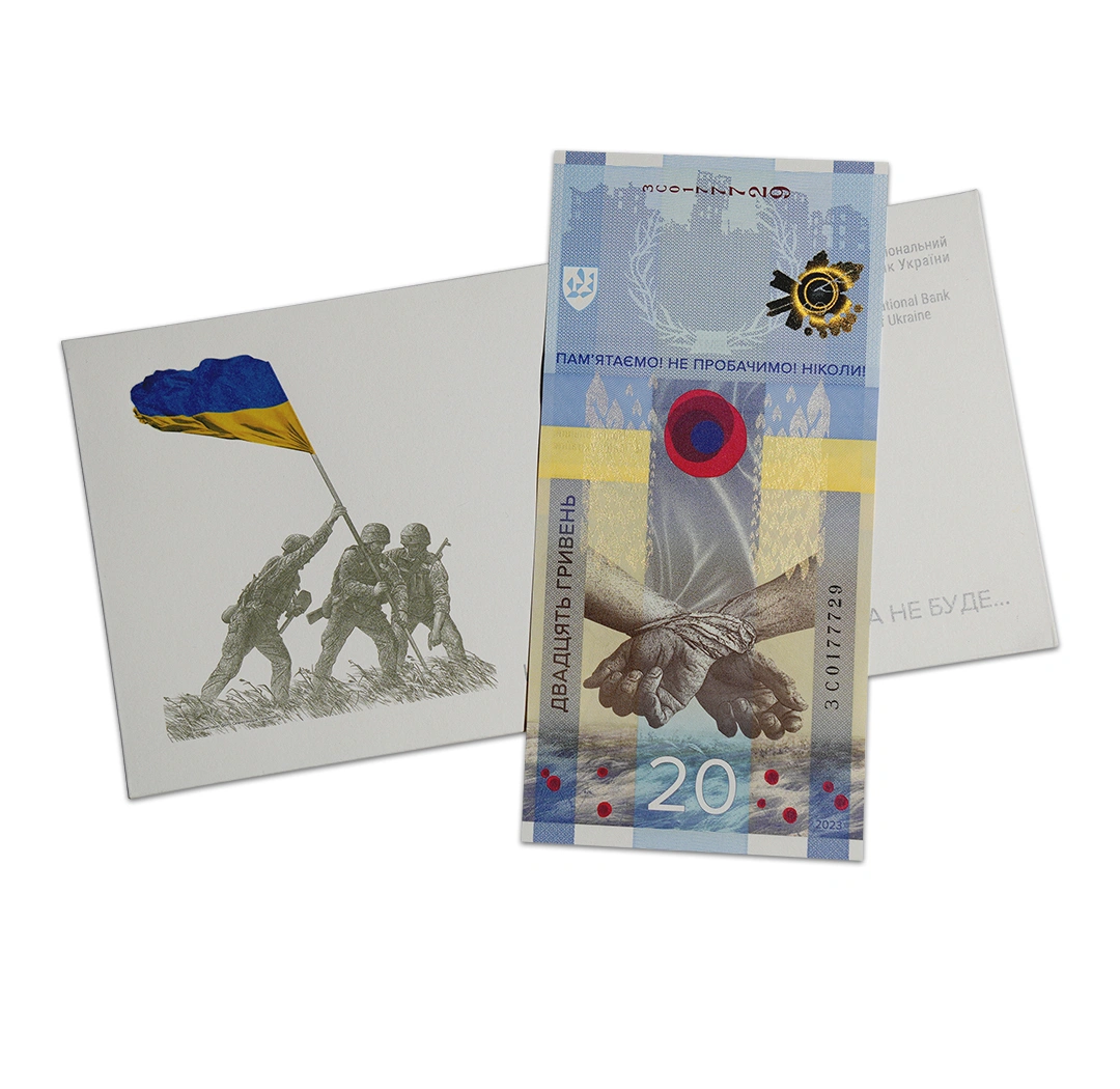 This 20 Ukrainian hryvnia note is a commemorative banknote issued by the National Bank of Ukraine to commemorate the 1st anniversary of the armed conflict between Russia and Ukraine. It is a blue and yellow note that has the theme “We will not forget! We will not forgive!” It is dated 2023, bears the signature of Andriy Pyshnyy, and measures 165 mm x 80 mm. Both sides of the note are vertically oriented. Its obverse side features the photo “Ukrainian soldiers are hoisting a flag” by Oleksandr Smirnov against the backdrop of fragments of the map of Ukraine and the flags of the countries that support Ukraine. Its reverse side shows a stylized composition of the physical and mental suffering Ukrainians face under occupation—hands tied behind a person’s back, crumpled cloth, a bullet wound in the form of a poppy flower, stylized wings made from candle flames, destroyed houses, and a crown of thorns. Security features include a colored composition consisting of a guilder rose and an anti-tank hedgehog. The note comes with a limited edition folder card and envelop.