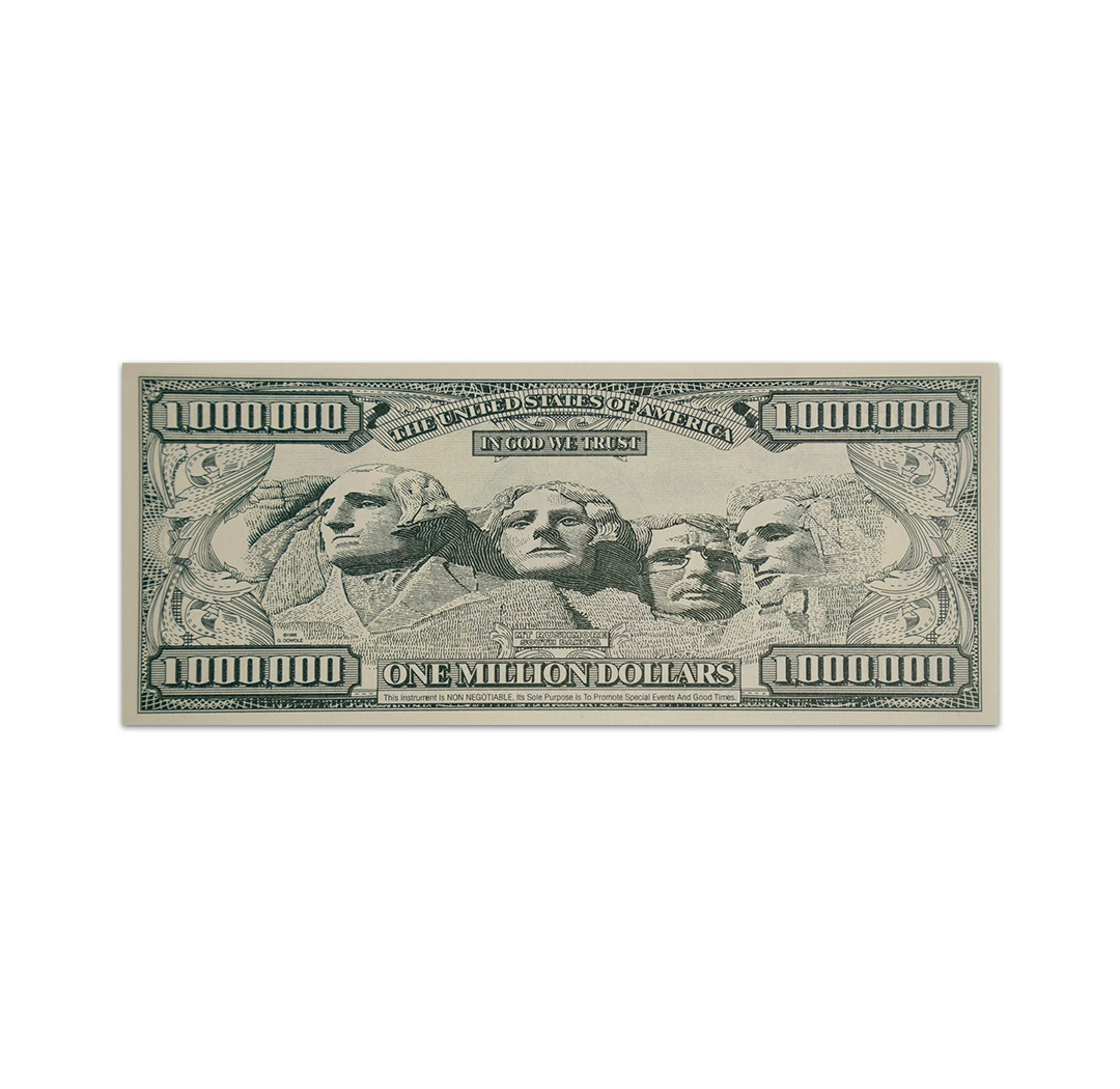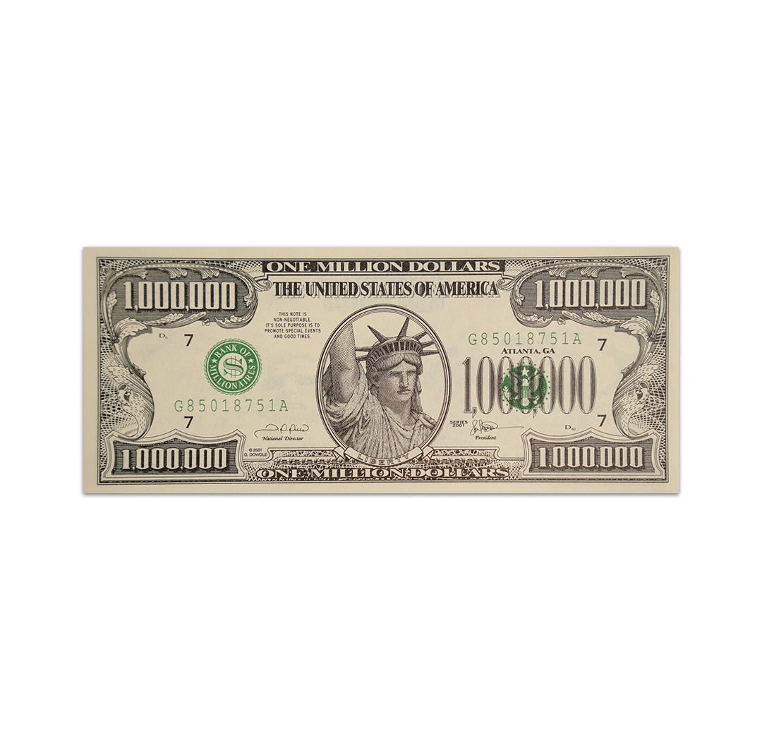 A $1 million fantasy note is a novelty or souvenir banknote, not real legal tender, produced by private companies to look like a high-denomination U.S. dollar bill, often featuring pop culture (Harry Potter, Taylor Swift) or patriotic themes (Statue of Liberty, Millennium) for fun or as collectibles, with various designs and security features like UV paper. The U.S. government has never issued a $1 million bill for public circulation.
