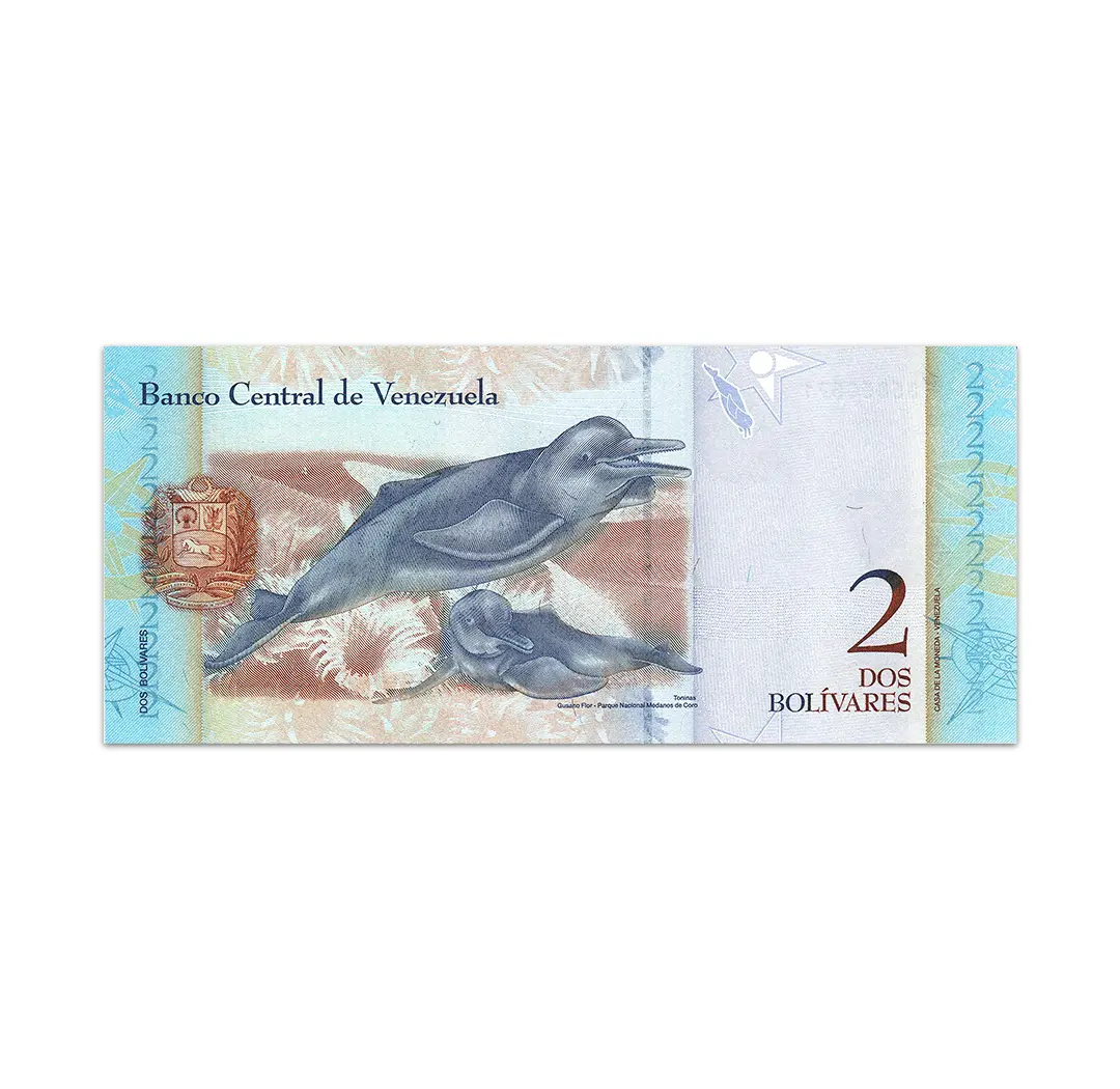 The Venezuela 2 Bolivar Fuerte banknote was issued in 2012. It has hints of blue and orange and was printed by the Casa De La Moneda-Venezuela. Featured on its obverse is Francisco de Miranda wearing a military uniform. The reverse of the paper bill depicts the coat of arms of Venezuela, two Amazon river dolphins, and the Parque Nacional Medanos de Coro. A gusano flor is also depicted. The banknote bears a solid security thread with a demetallized BCV 2 and a watermark that shows Francisco de Miranda and an electrotype 2. The banknote is 156 x 69 mm in size and is in uncirculated condition.