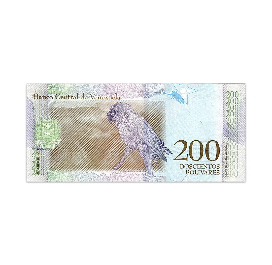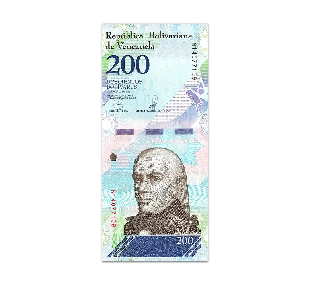 The Venezuela 200 Bolivar Soberano banknote was released by the Central Bank of Venezuela in 2018. This violet banknote features Francisco de Miranda on its obverse. The reverse of the paper bill depicts the coat of arms of Venezuela and a military macaw bird in front of the Waraira Repano National Park. The note carries security thread varieties and a watermark that reveals Simon Bolivar and an electrotype BCV. It is 156 x 69 mm in size and is in uncirculated condition.