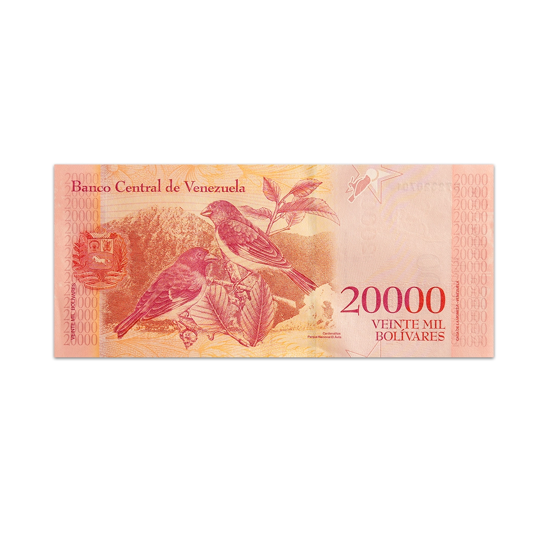The Venezuela 20,000 Bolivar Fuerte banknote was issued by the Central Bank of Venezuela in 2017. The obverse of the red banknote is in a vertical orientation and features Simon Bolivar wearing a military uniform. The reverse of the paper bill depicts the coat of arms of Venezuela, two black-hooded red siskin birds, and the Parque Nacional El Avila. Its security features include a 3-mm holographic windowed security thread with a demetallized BCV and a watermark that reveals Simon Bolivar and an electrotype 20000. The banknote is 156 x 69 mm in size and is in uncirculated condition.