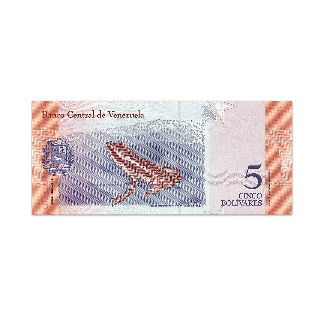 The Venezuela 5 Bolivar Soberano Banknote from 2018 features independence leader Jose Felix Ribas. His portrait on the front design was from a painting by Martin Tovar y Tovar. At the back is the Veragua stub foot toad, the Henri Pittier National Park in Aragua Valley, and the coat of arms of Venezuela. The banknote is 156 x 69 mm in size and contains a Holographic windowed security thread with demetalized BCV to enhance its security features. An image of Simon Bolivar and electrotype BCV is also made visible under a UV light.