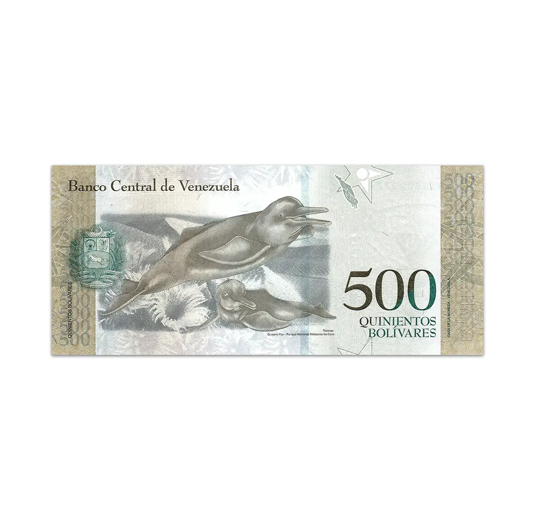 This Venezuela 500 Bolivar Fuerte Banknote was released by the Central Bank of Venezuela in 2016. It has a color combination of blue, brown, and green. Featured on its obverse is Francisco de Miranda in a military uniform. The back of the paper bill depicts the coat of arms of Venezuela, two Amazon river dolphins, a gusano flor, and the Parque Nacional Medanos de Coro. The banknote bears a motion windowed security thread and a solid security thread. It also has a watermark that shows Francisco de Miranda and an electrotype 500. The banknote is also equipped with a registration device in the form of a dolphin. It is 156 x 69 mm in size and is in uncirculated condition.