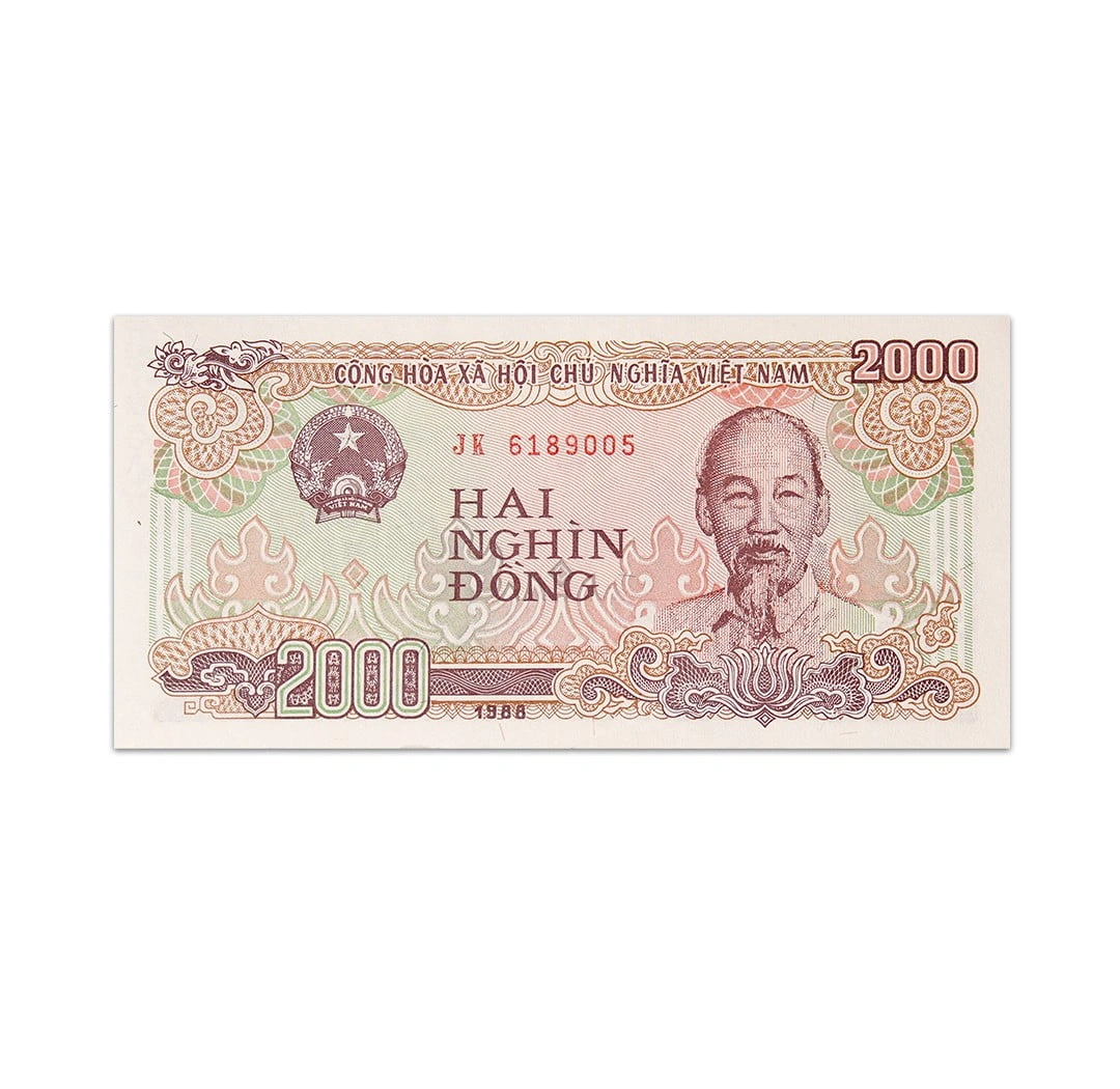 The Vietnam 2,000 Dong Banknote that features a portrait of Ho Chi Minh was issued in 1988. The obverse side of the note features the coat of arms of Vietnam and former Prime Minister Ho Chi Minh while the reverse side features four female workers in a textile factory. The banknote is 135 x 65 mm in size and does not contain any security threads however when placed under a UV light, an image of a flower pattern is visible.