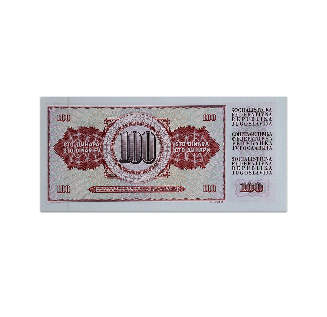 The Yugoslavia 100 Dinara banknote is part of the 1986 issues. It measures 70 x 148 mm. The obverse side shows the Equestrian statue "Peace" of Augustincic in the garden of the United Nations, New York. The reverse side features the denomination.
