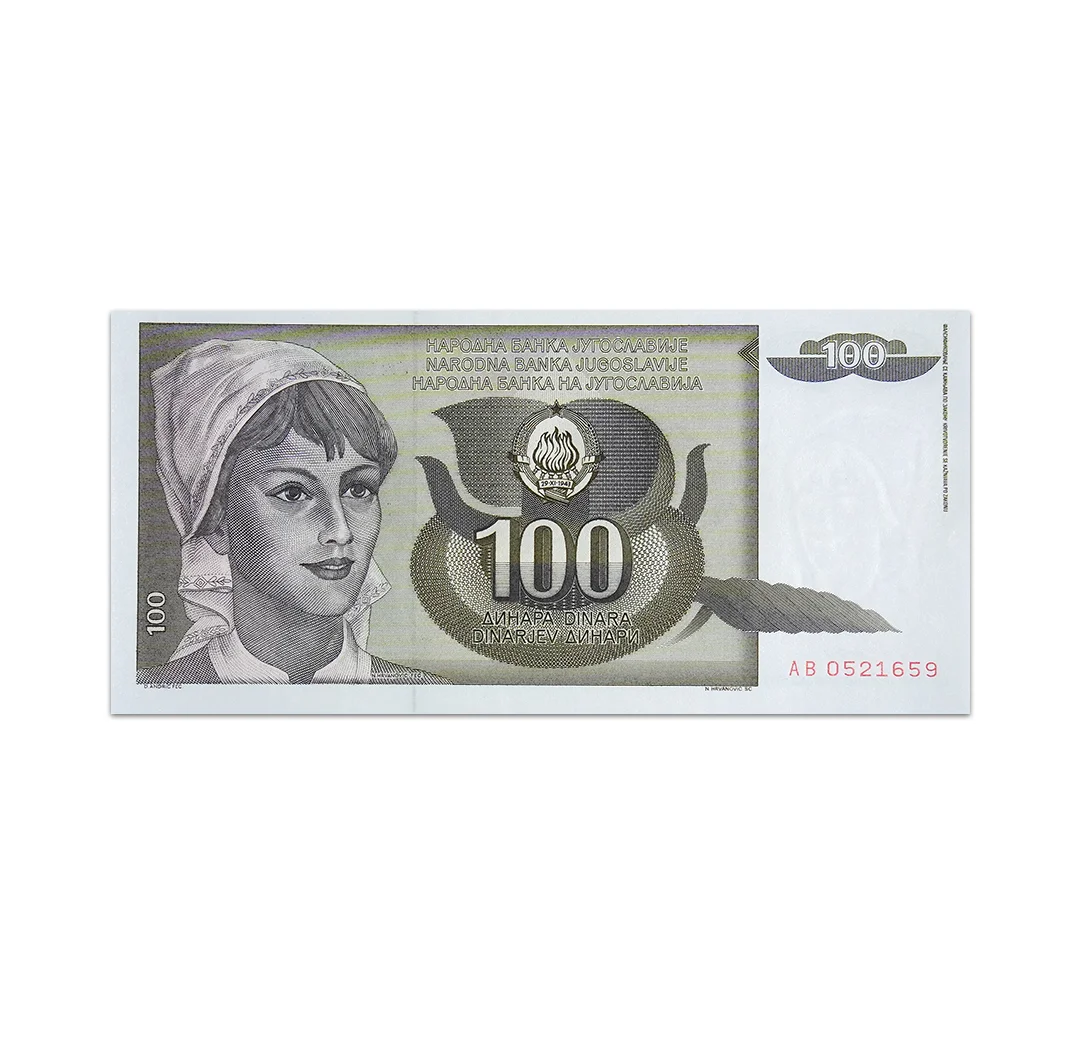 The Yugoslavia 100 Dinara banknote is part of the 1991 issues. It measures 151 x 72 mm. The obverse side shows a woman. The reverse side features a stylized wheat ear.
