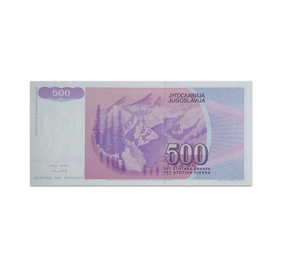 The Yugoslavia 500 Dinara replacement banknote is part of the 1992 issues. It measures 159 x 76 mm. The obverse side shows a boy. The reverse side features a mountain scene. This banknote contains a watermark with a portrait of a boy design.