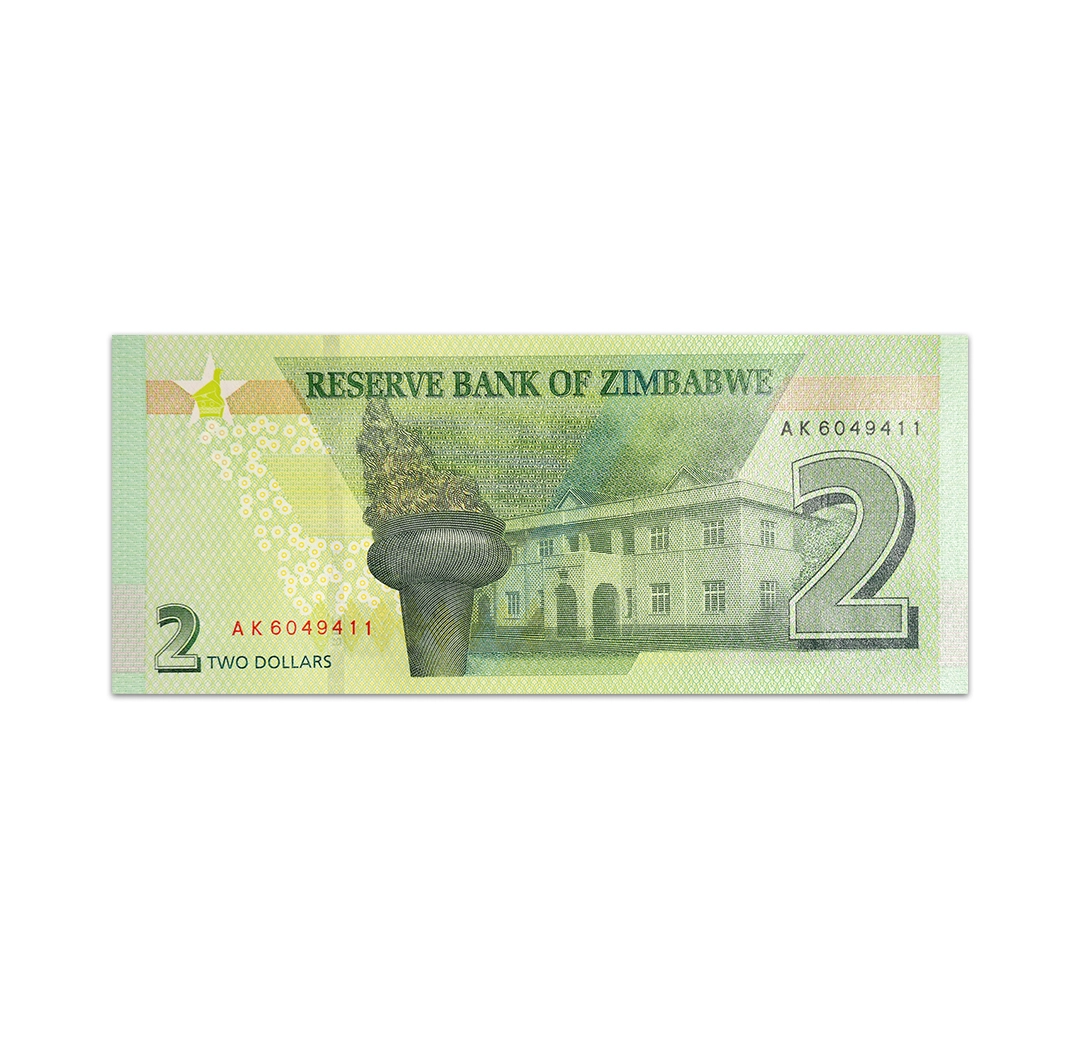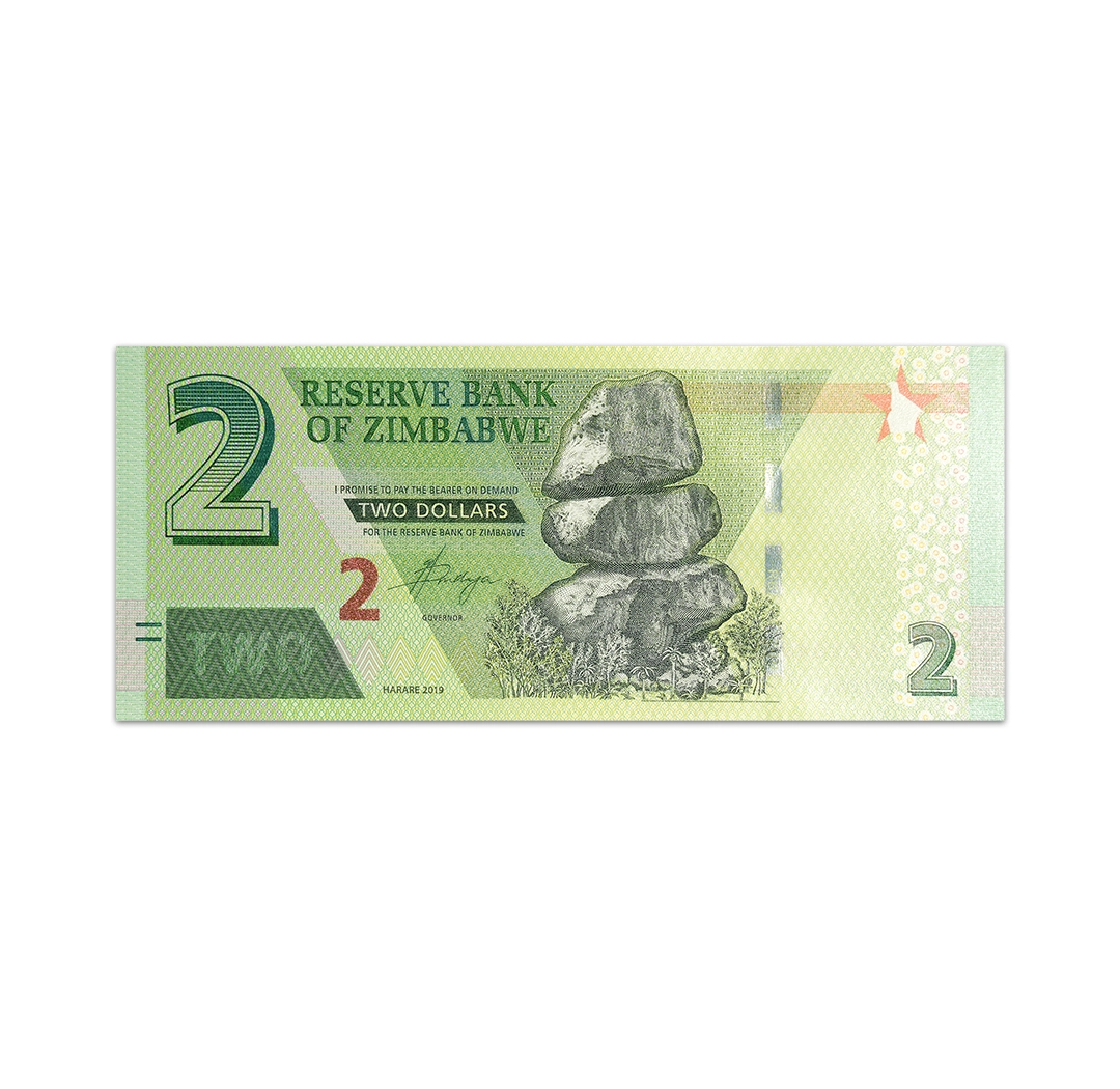 This uncirculated 2 Zimbabwean dollar banknote is a standard circulation banknote issued by the Reserve Bank of Zimbabwe. It is a green banknote that is dated 2019, bears the signature of John Panonetsa Mangudya, and measures 155 mm x 66 mm. Its obverse side features the Chiremba Balancing Rocks of Epworth and a color-shifting denomination. Its reverse side depicts the Eternal Flame of Independence monument and the Parliament House in Harare. Security features include a windowed security thread with a demetalized RBZ and a watermark of a Zimbabwe bird with a vertical electrotype RBZ.